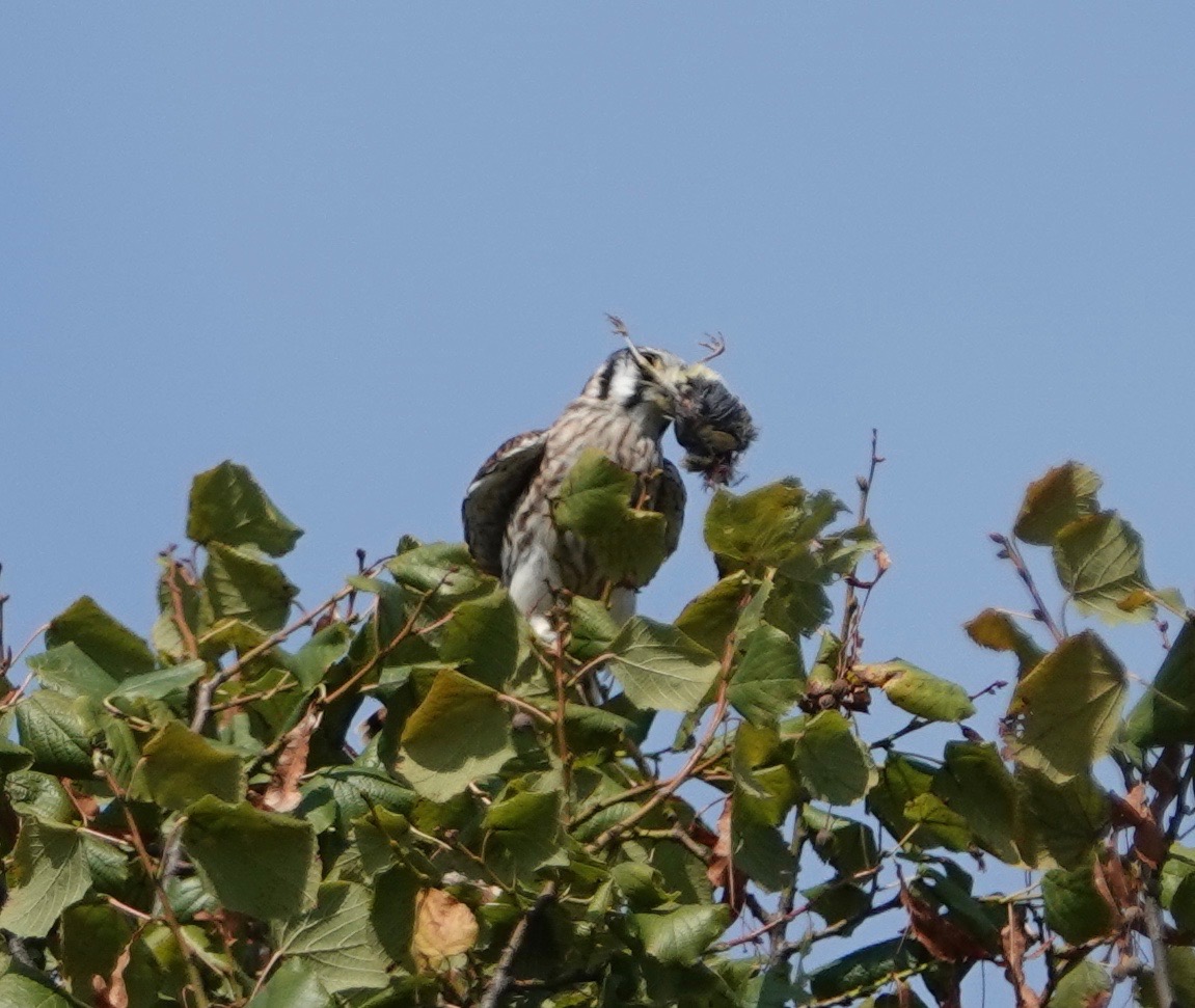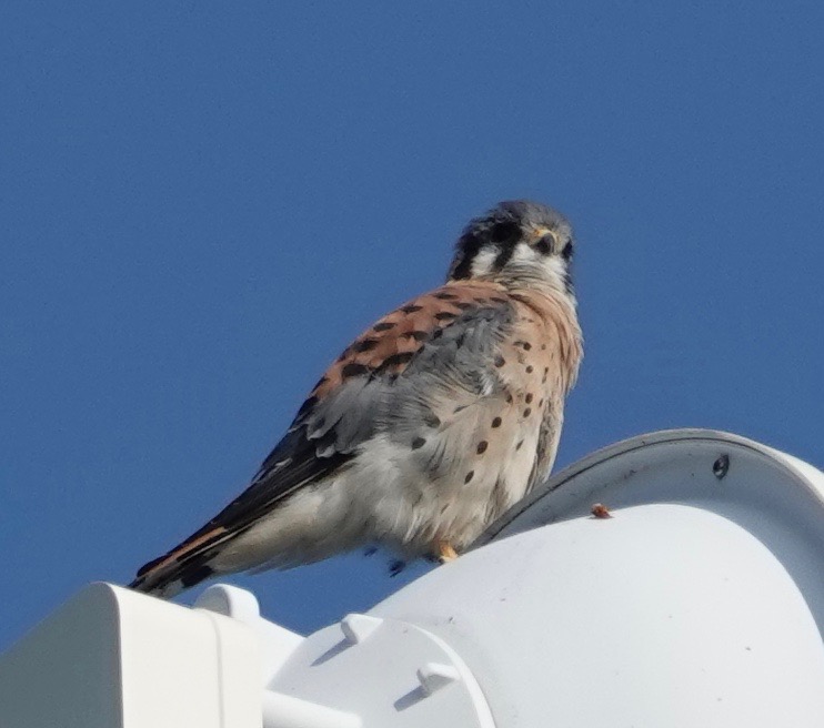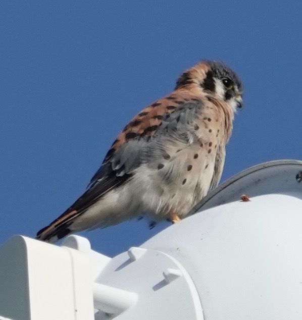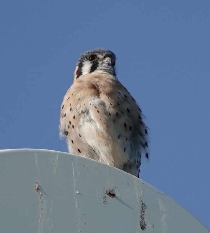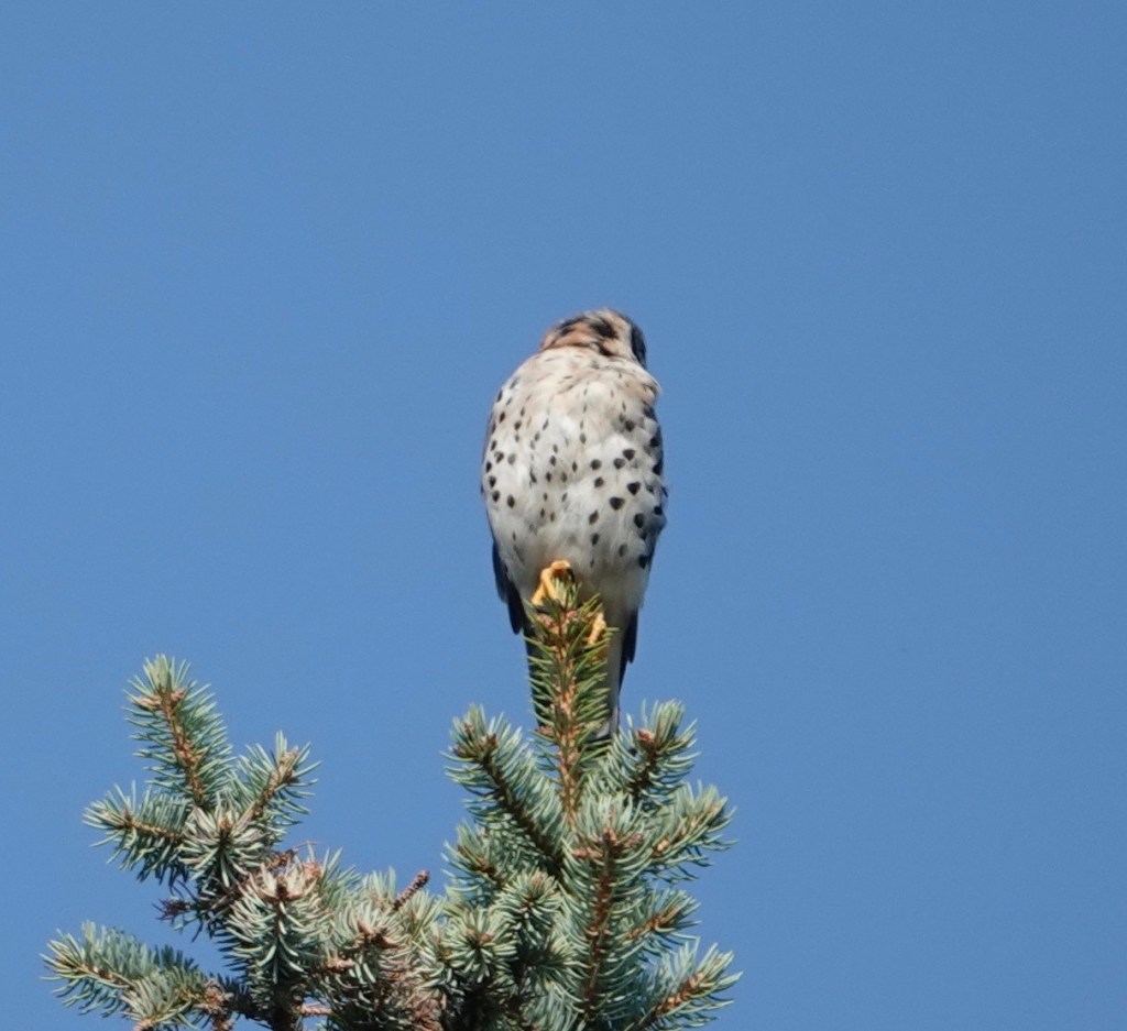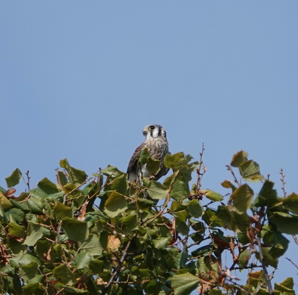 A male American Kestrel at one end of Green-Wood. A different male American Kestrel in the middle of Green-Wood. While photographing this one, I heard two others.And soon found them: male on the left, female on the right.About twenty minutes later, the female had some prey.