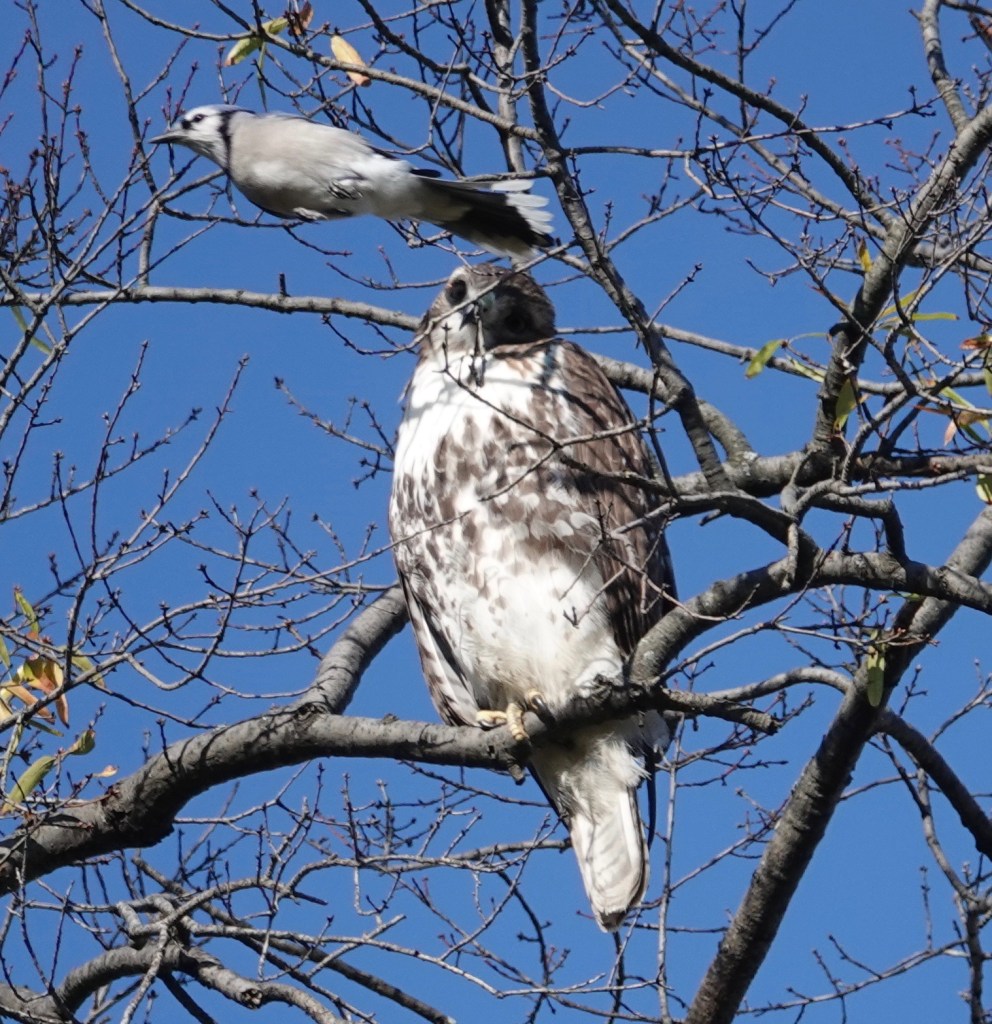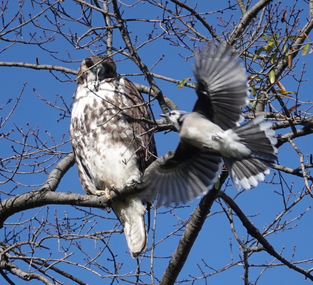 Another day, elsewhere in Green-Wood: possibly the same heavily-marked juvenile being harassed by a Jay.