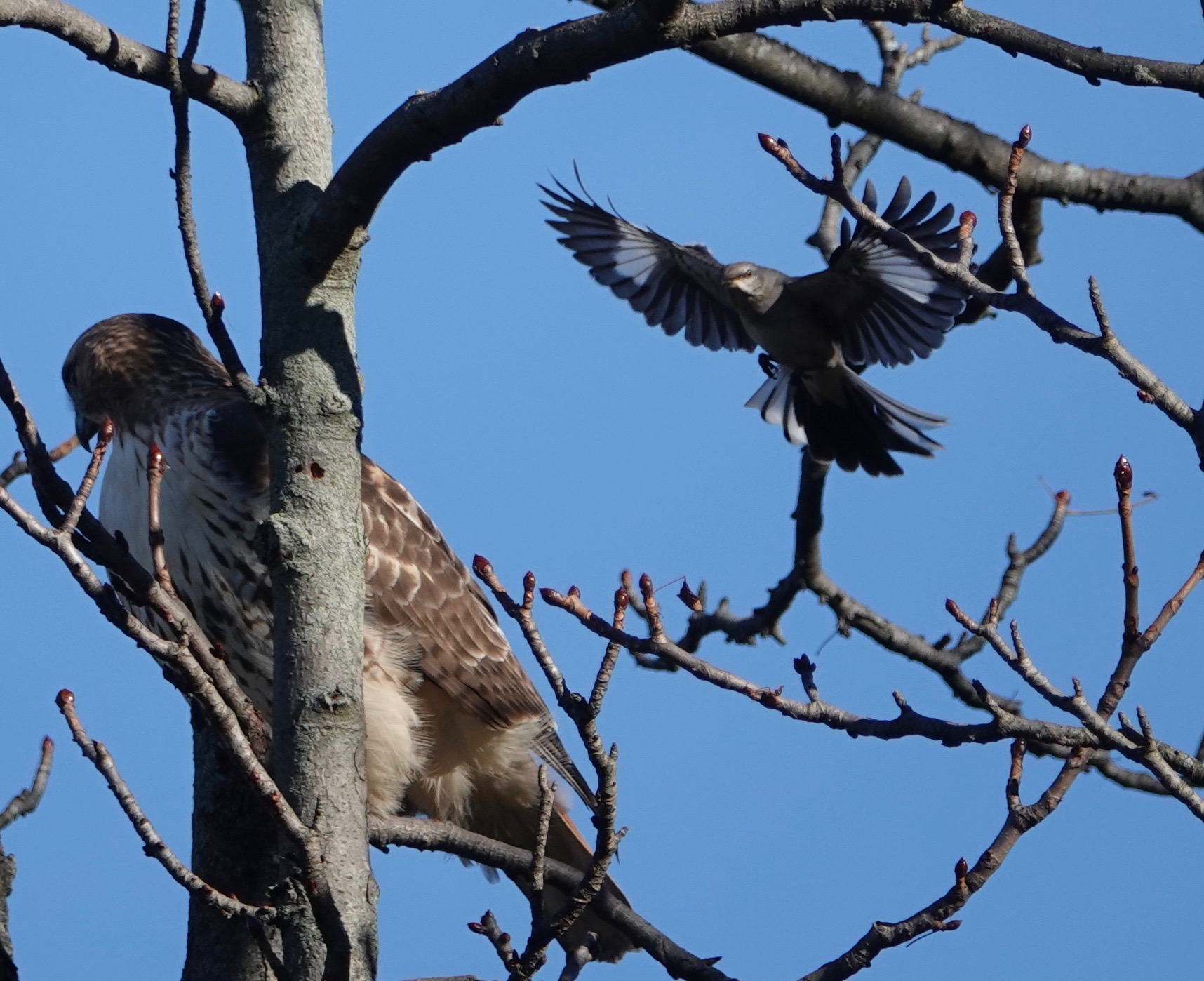 Now an adult RT, being swooped upon by a bold Northern Mockingbird.
