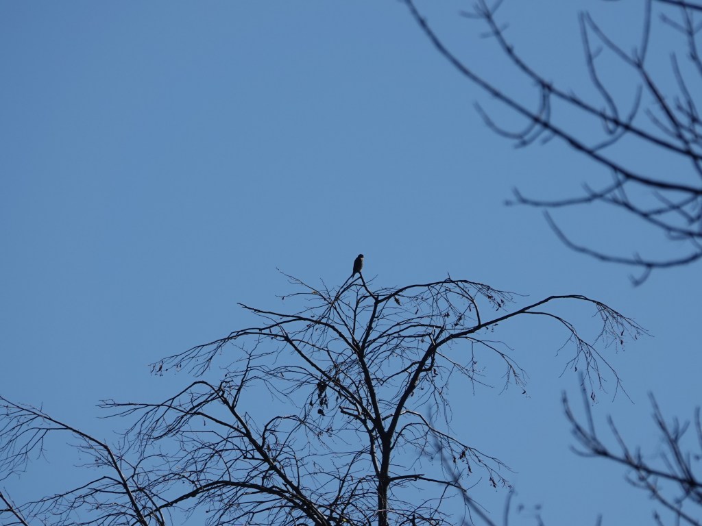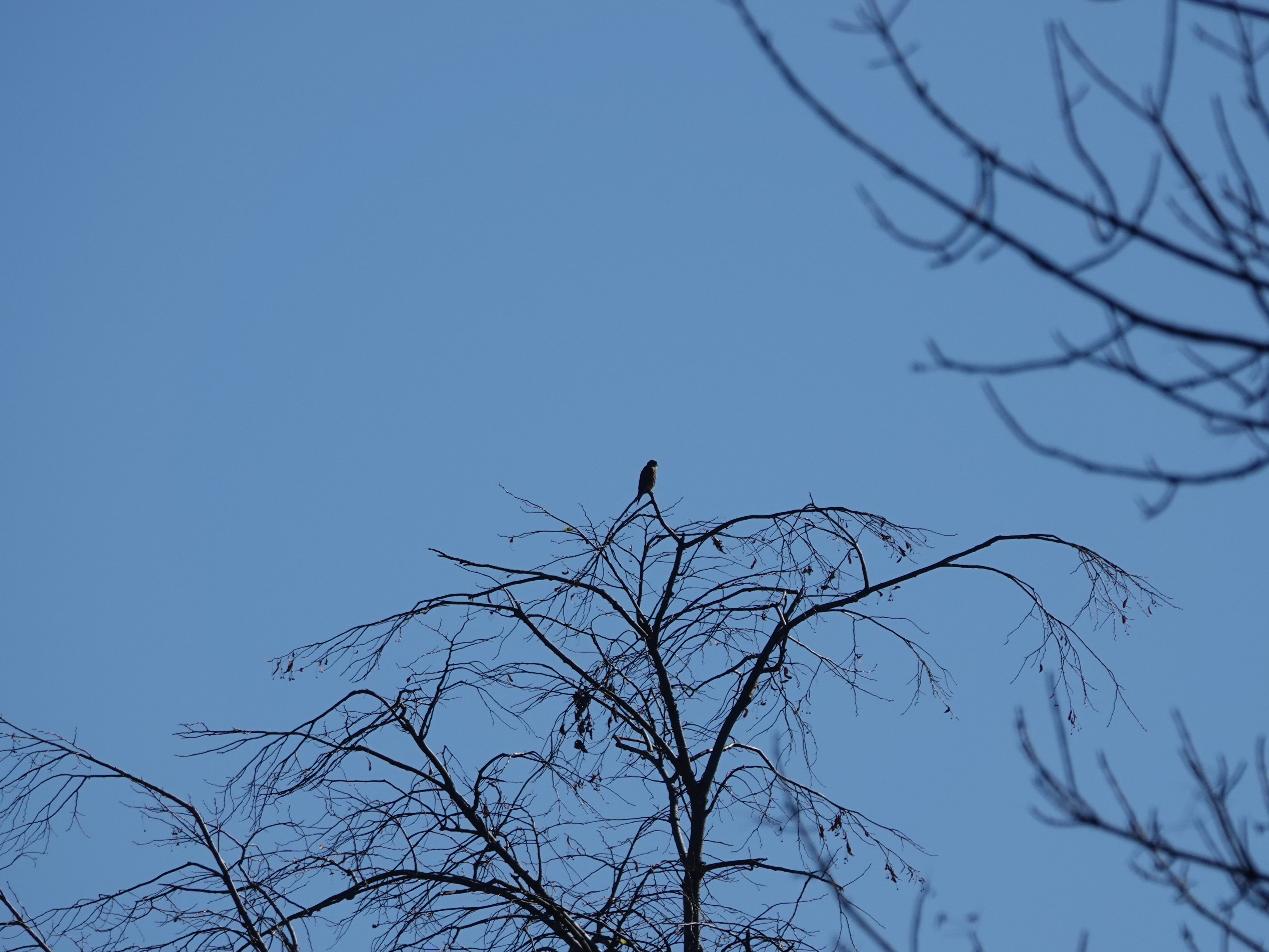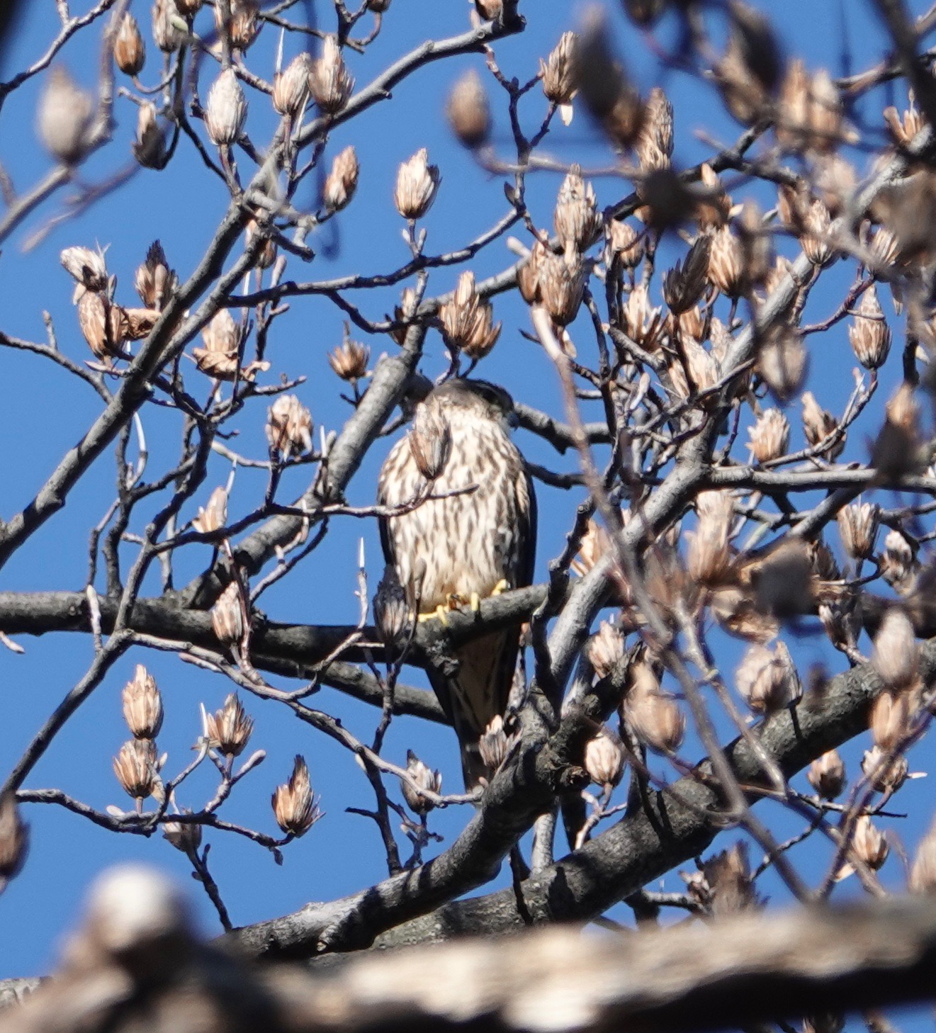 From a distance: the large-headed silhouette of a small falcon. This tree on a hill is Merlin country in the winter months, but the last time I saw something up there a few weeks ago it was an American Kestrel. This time, by the time I hustled up closer, the bird was gone. A couple of other birders had seen where it went.