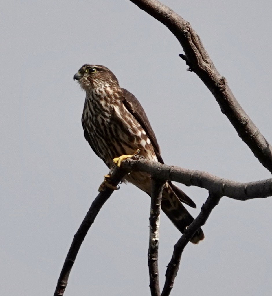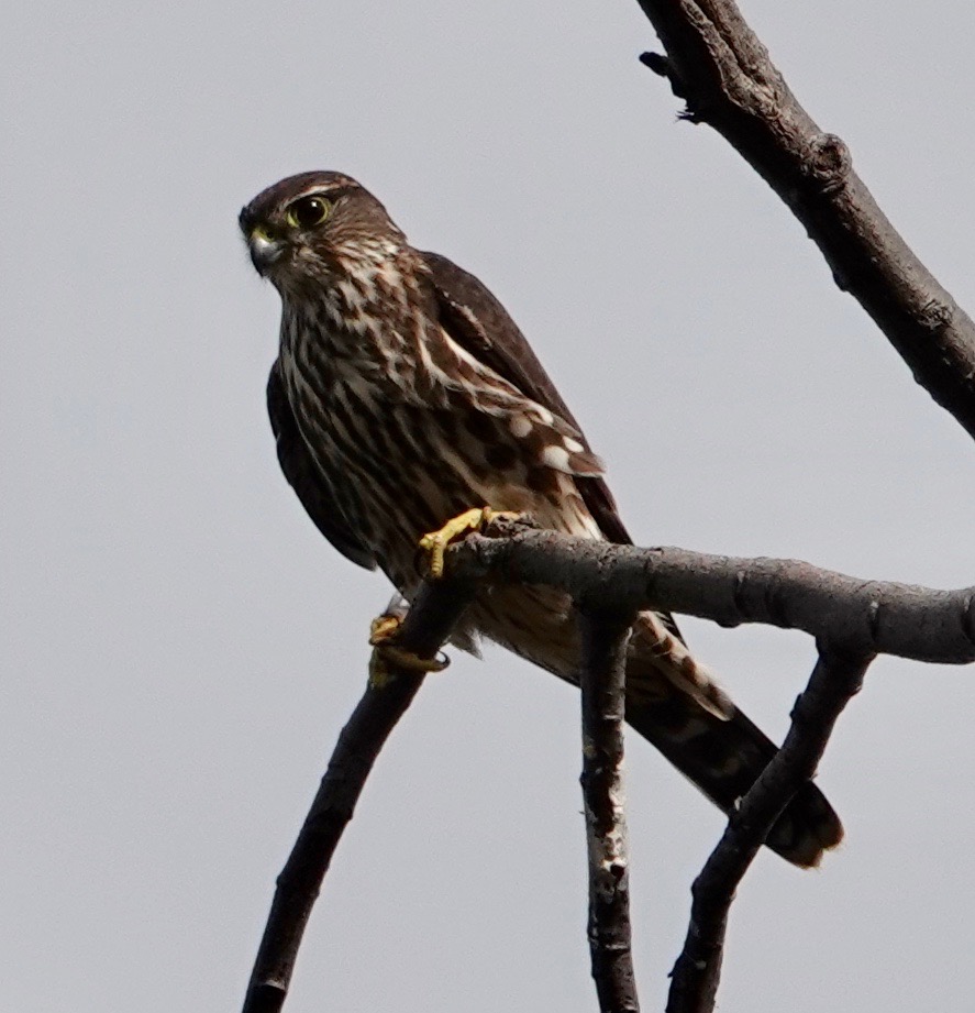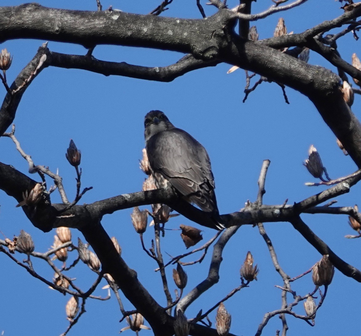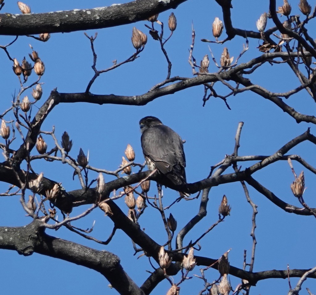 From a distance: the large-headed silhouette of a small falcon. This tree on a hill is Merlin country in the winter months, but the last time I saw something up there a few weeks ago it was an American Kestrel. This time, by the time I hustled up closer, the bird was gone. A couple of other birders had seen where it went.