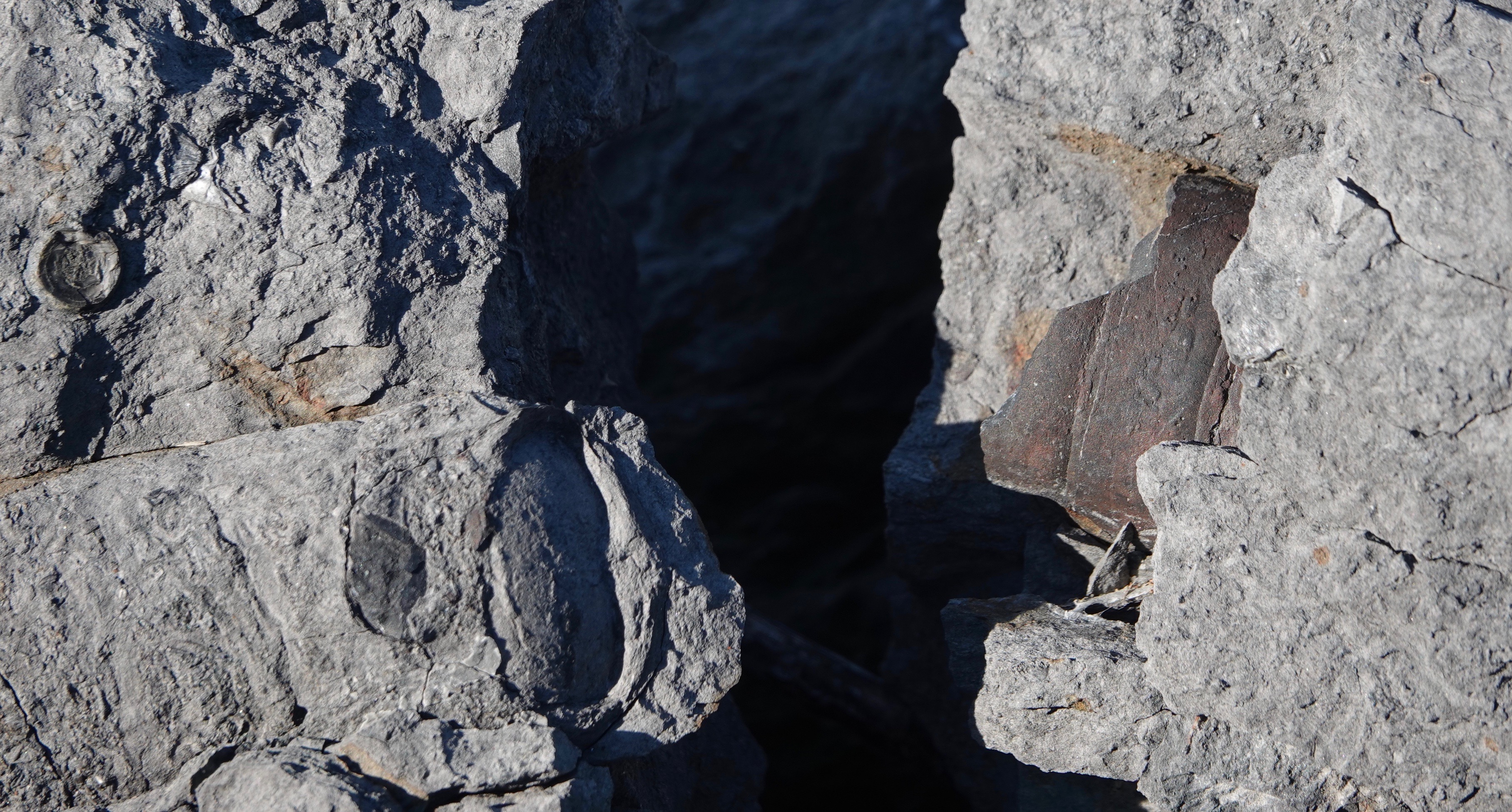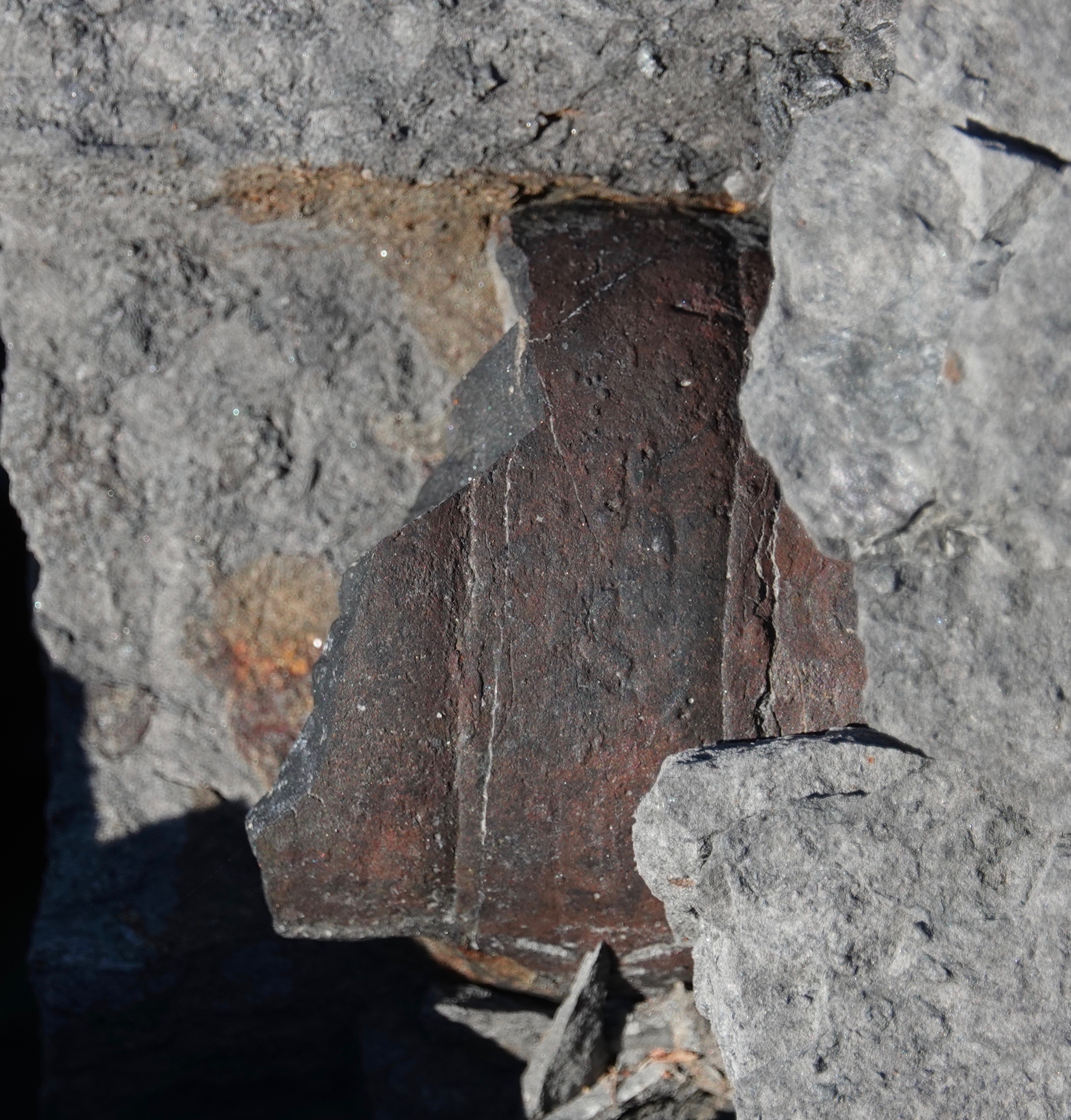 The most spectacular sighting on this rip-rap of fossiliferous rocks, first spotted by Molly. These segments are about 2″ wide. Is this, as fossil-co-explorer Paul thinks, a Eurypterid or sea scorpion. It reminded us all of lobster.