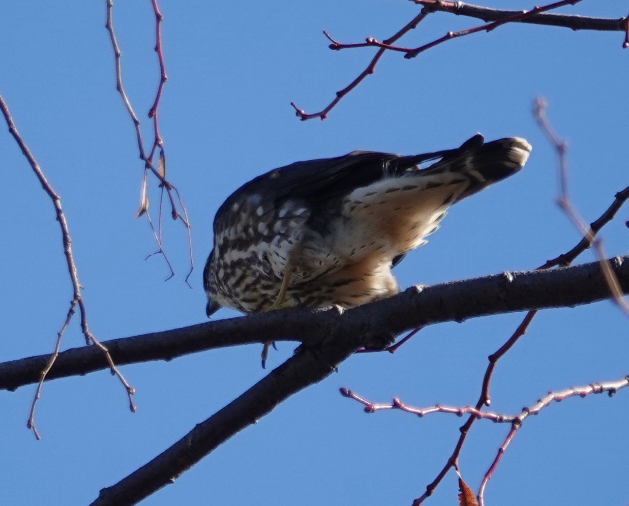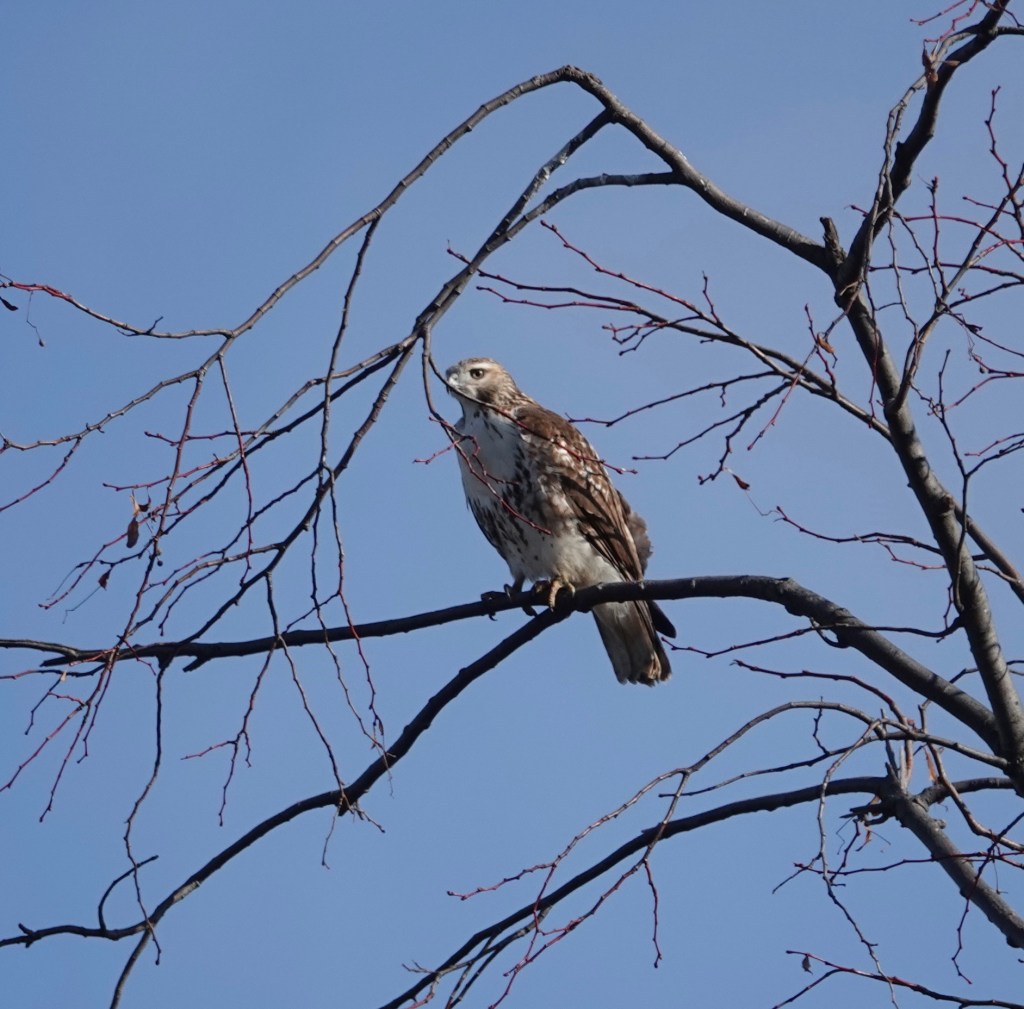 The Merlin took off as this Red-tailed Hawk came into the tree. Earlier this month, the Merlin flew off as a Coopers landed in the tree.