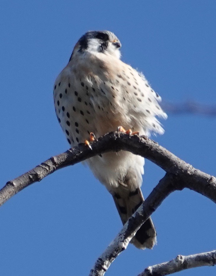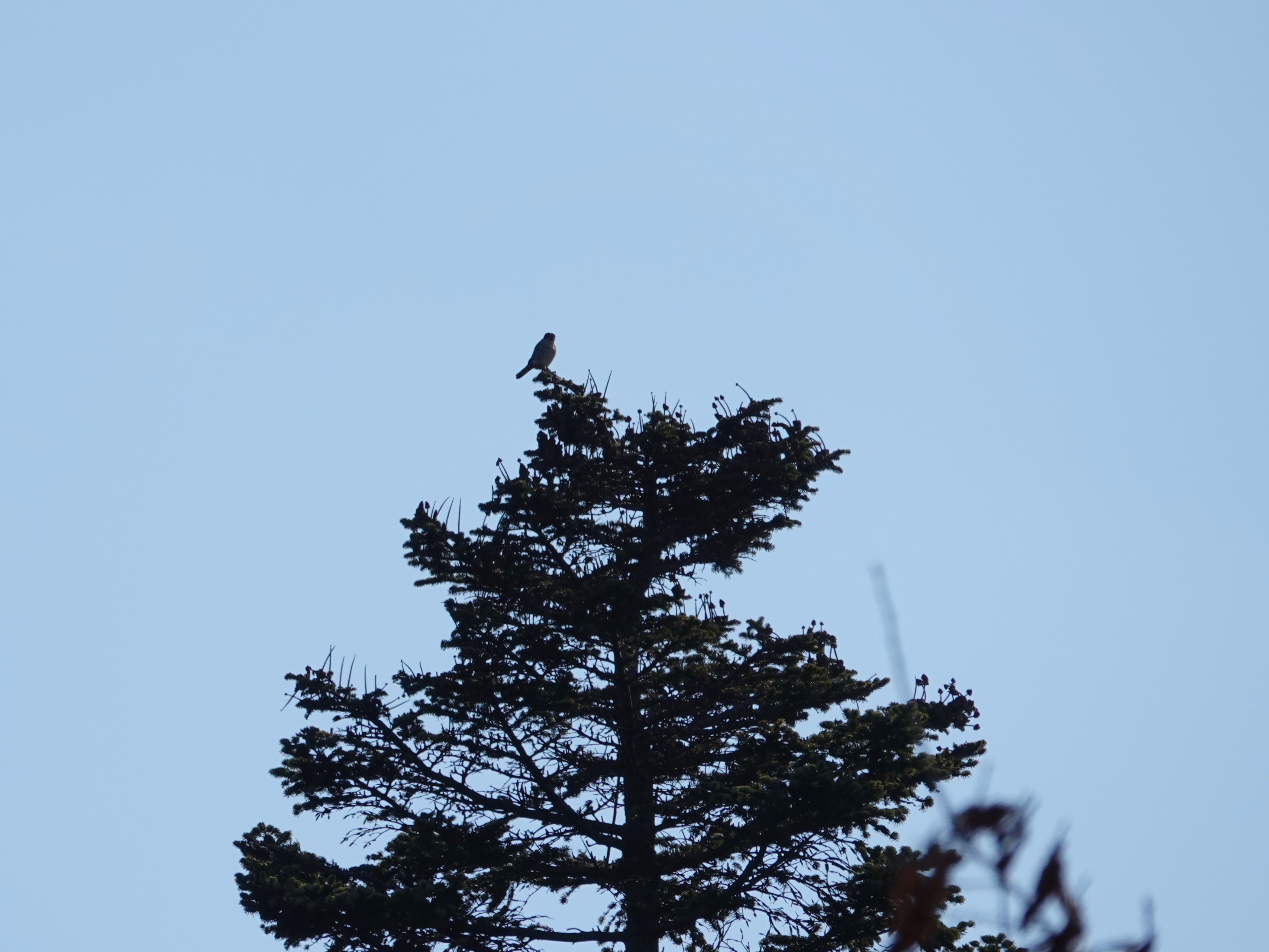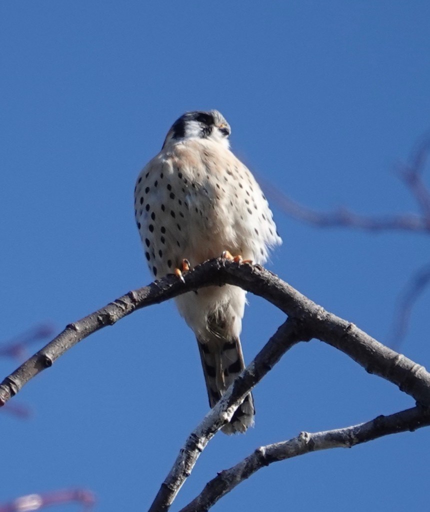There are some trees that I always look at if I’m near them. I have my patch, the raptors have theirs. Standard small falcon silhouette above. I’ve never seen a Merlin on this tree, so I had to get closer to double-check. American Kestrel male, a regular up there.
