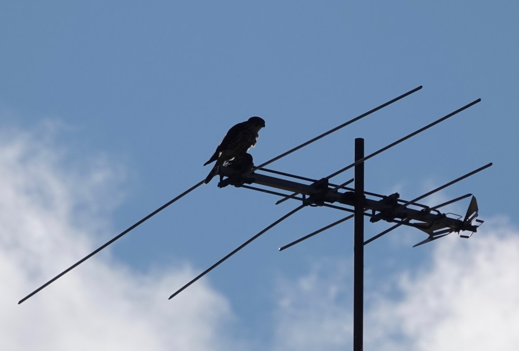 The low winter sun is murder on the naturalist’s eyes, but whenever I’m heading home and turn the corner onto 5th Avenue I always glance up at the tall antenna tower at 40th Street. A female American Kestrel has been up there at last once a day all winter so far. Anyway, this old TV antenna is right across the street from the antenna tower. And that, my friends, is a classic Falco silhouette. Big round head with small bill, long narrow tail. But: