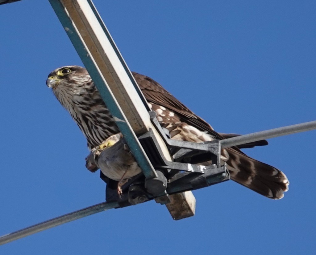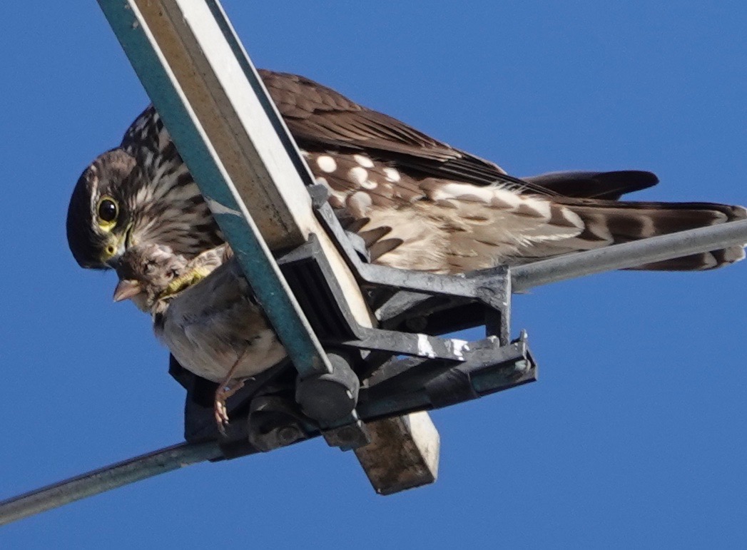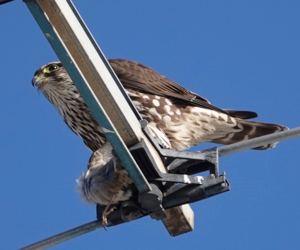 This is a Merlin. With House Sparrow prey. I was about to cross the street to get a different angle on the situation when: