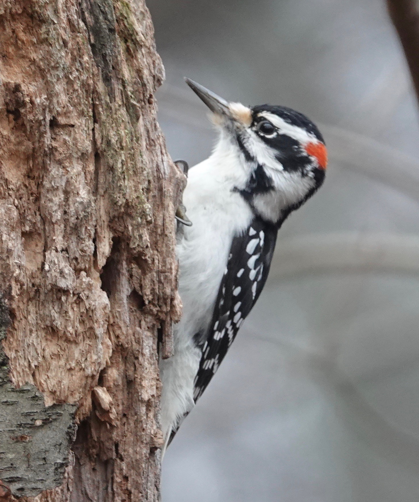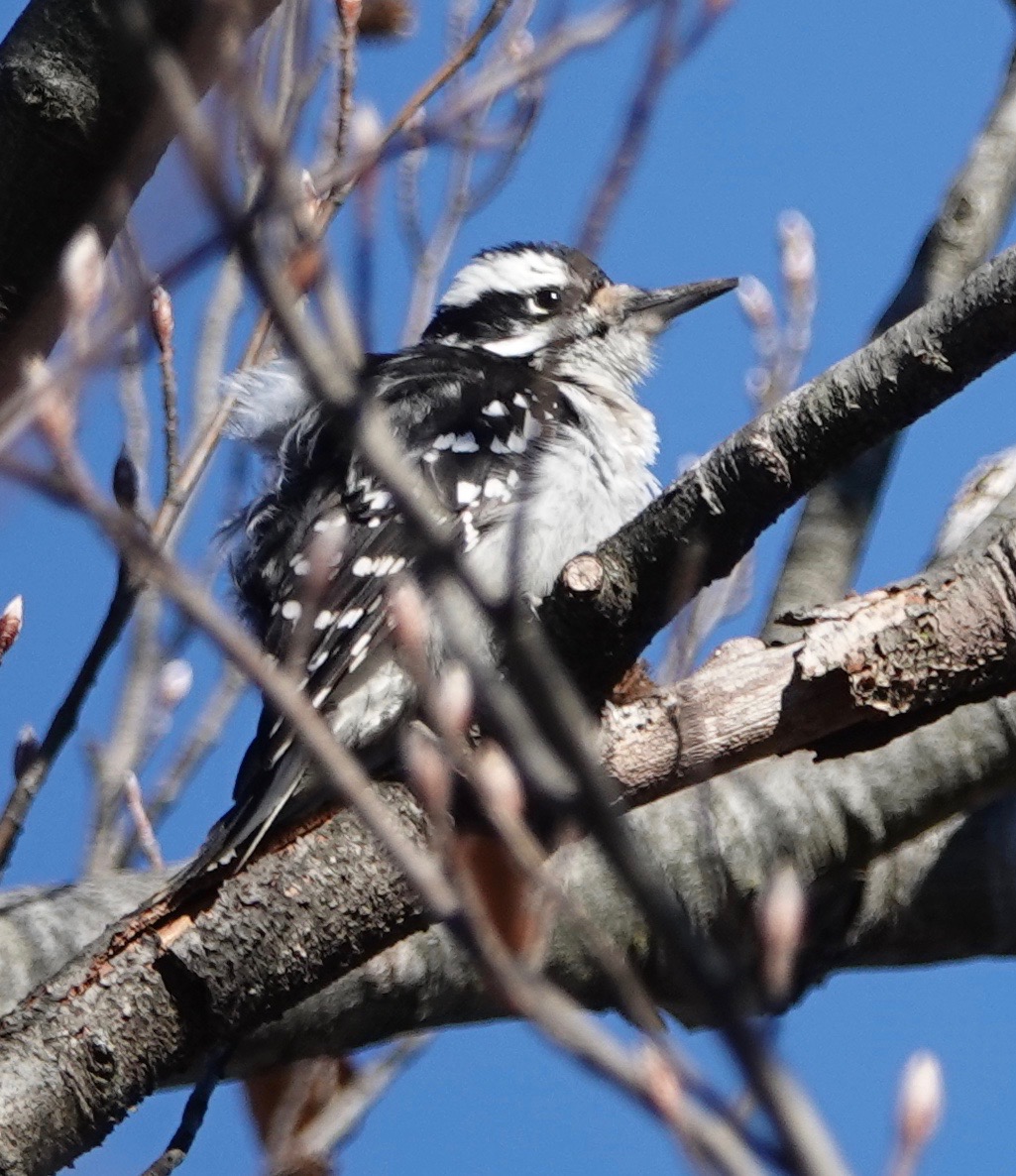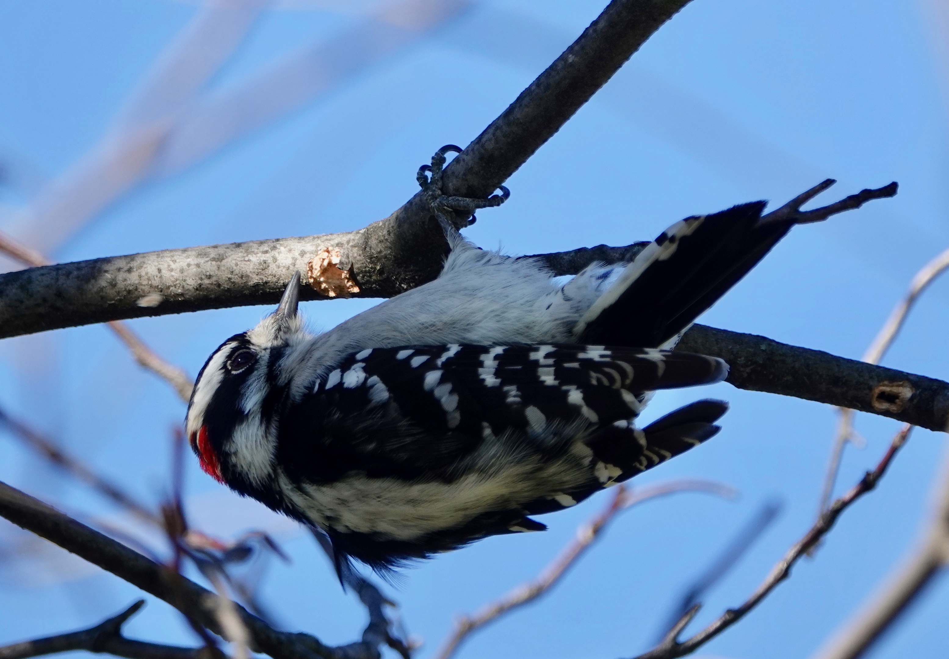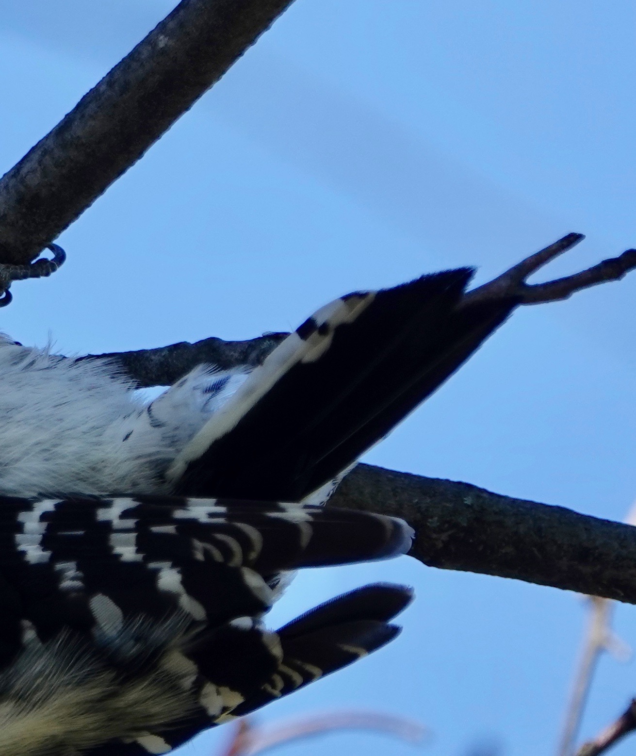 But here’s a view of of the distinctive black spotting on the outer tail feathers of the Downy. No spots on the white on the Hairy.