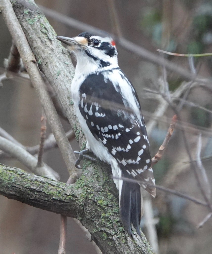 Here’s a male Downy Woodpecker (Dryobates pubescens) for comparison. These are more frequently seen here, so I always have to do a double-take to make sure I know what’s what. Here’s a handy guide to telling them apart. I usually look to the bill length.