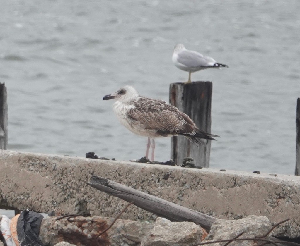 To spice things up, this is Great Black-backed in its first winter, or so I judge. Ring-billed in the background.