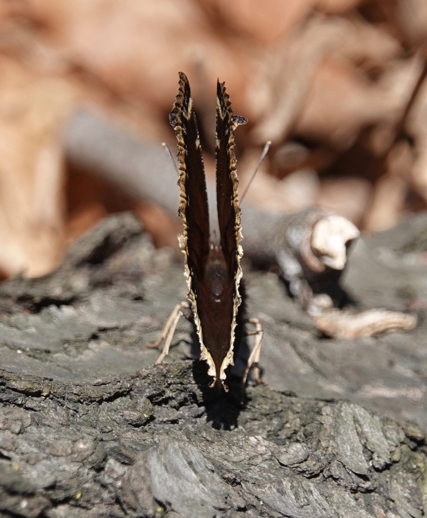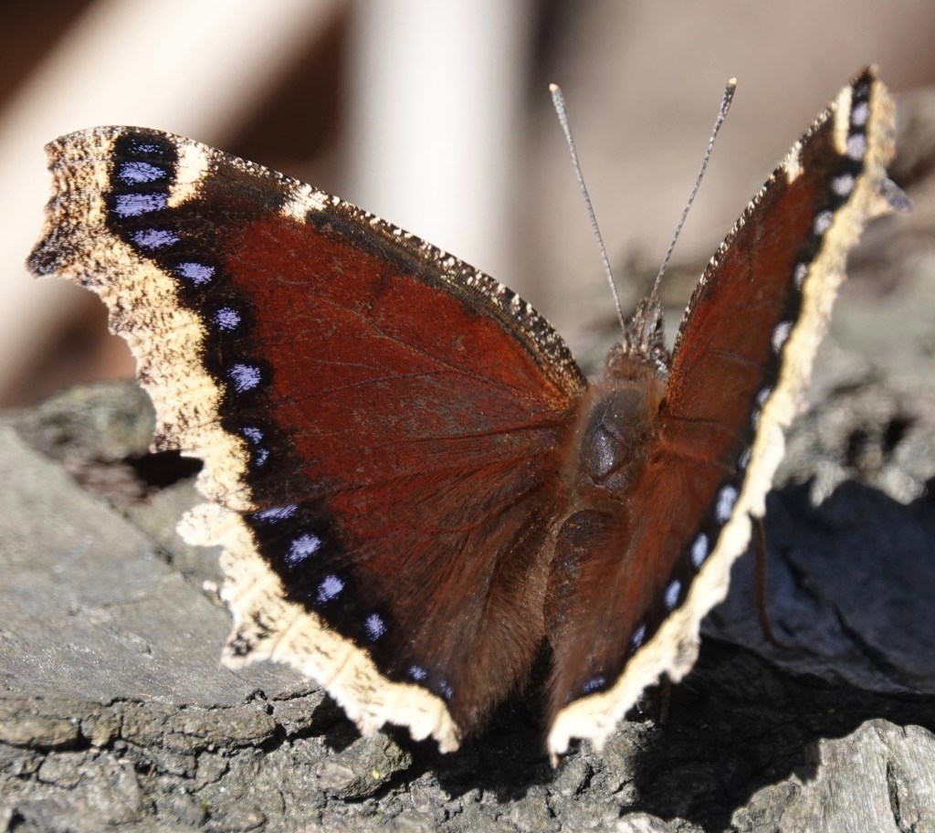 Nymphalis antiopa, also known as the Camberwell Beauty in Britain, overwinters as an adult. Remember when I found one last spring tucked into some dead wood? That was March 20, 2022.