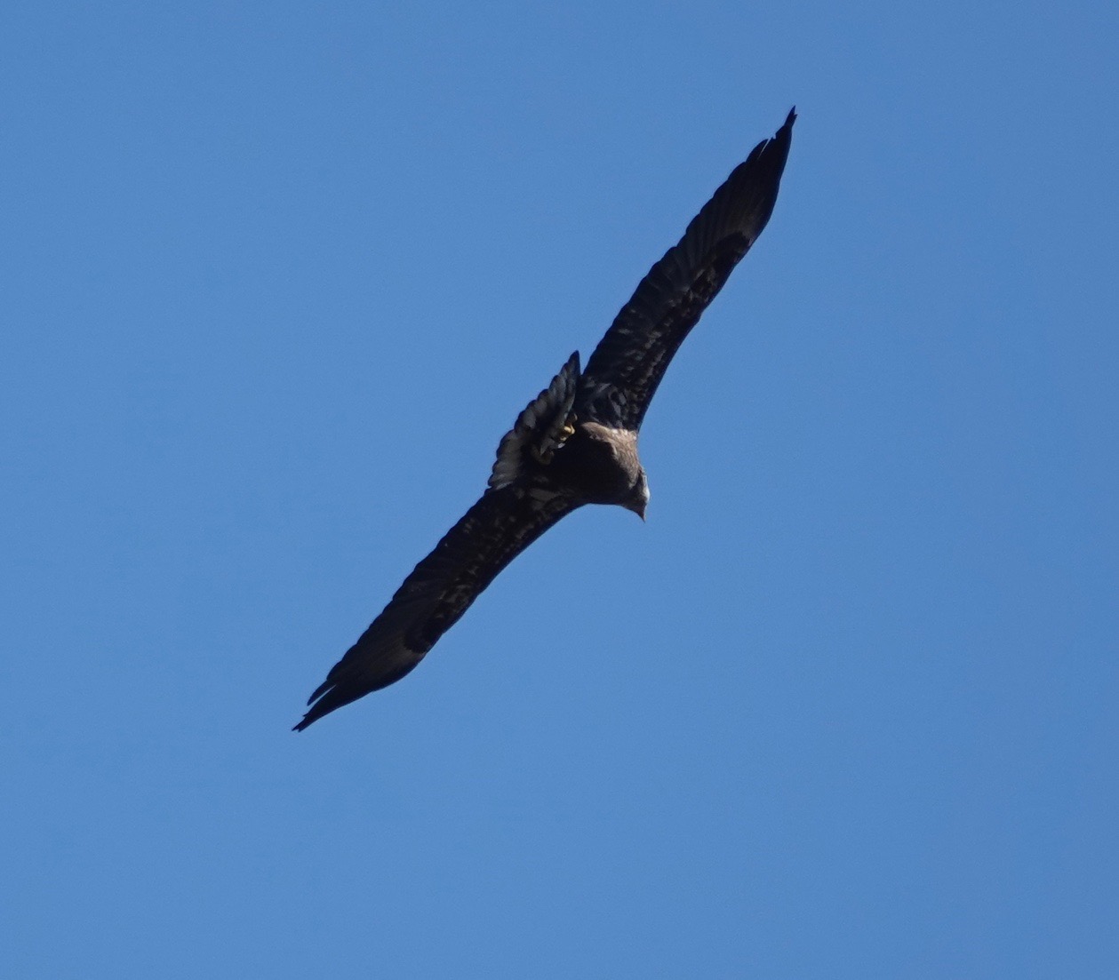 An adult Bald Eagle has been hanging out at Prospect Park for a few weeks. It’s even made the gossip pages of New York Magazine. It’s thought this is one of the nesting pair on one of the little islands in Jamaica Bay. Yes, nesting Bald Eagles in Brooklyn! (Making for the second city nest: a pair on Staten Island has been going strong for several years.) I set out last week to Prospect Park to see if I could see the bird. One block away from home, I saw an adult eagle overhead. It was heading south-ish over Sunset Park and may have just left Green-Wood. (All this is about 4 miles from the nest.)
