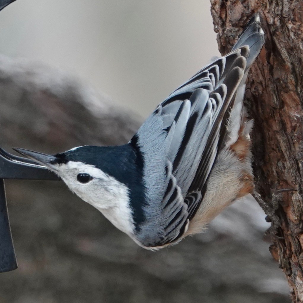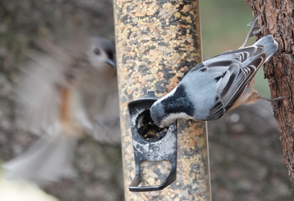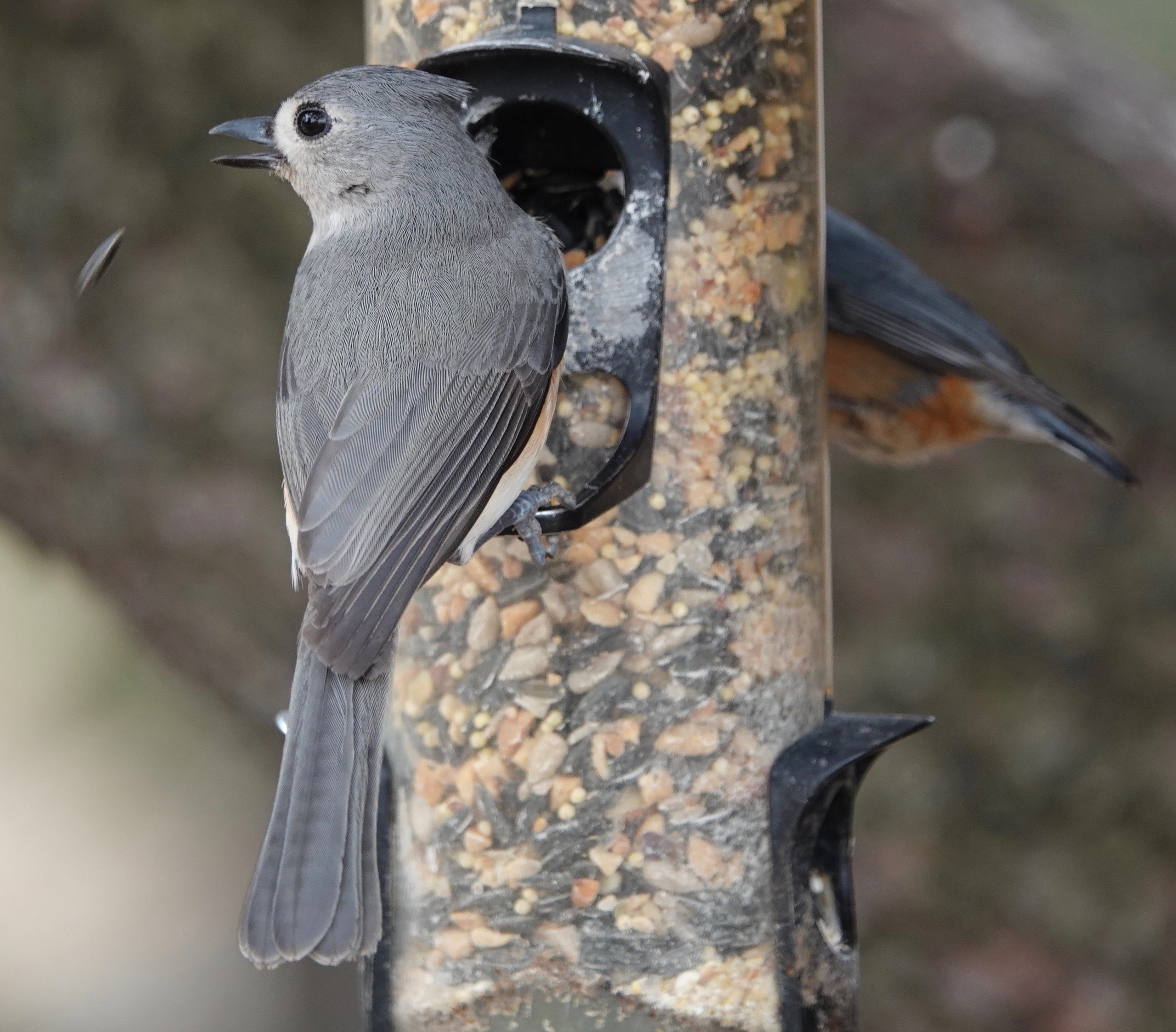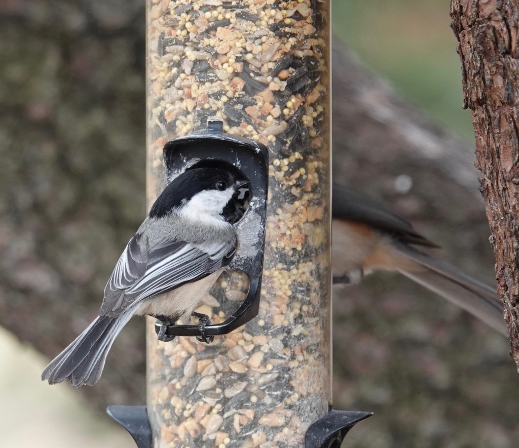 The long-time feeder hanging in the Callery Pear tree above Sylvan Water lost its home when the tree was cut down this winter. The feeder was moved to a pine nearby. Here are highlights of some ten minutes watching of the rapid-fire action among half a dozen Tufted Titmouses, Three White-breasted Nuthatches, one Red-breasted Nuthatch, and a Black-capped Chickadee.
