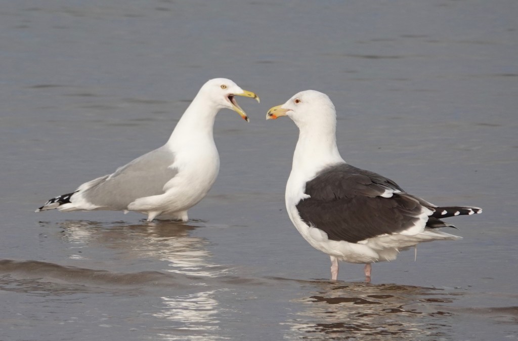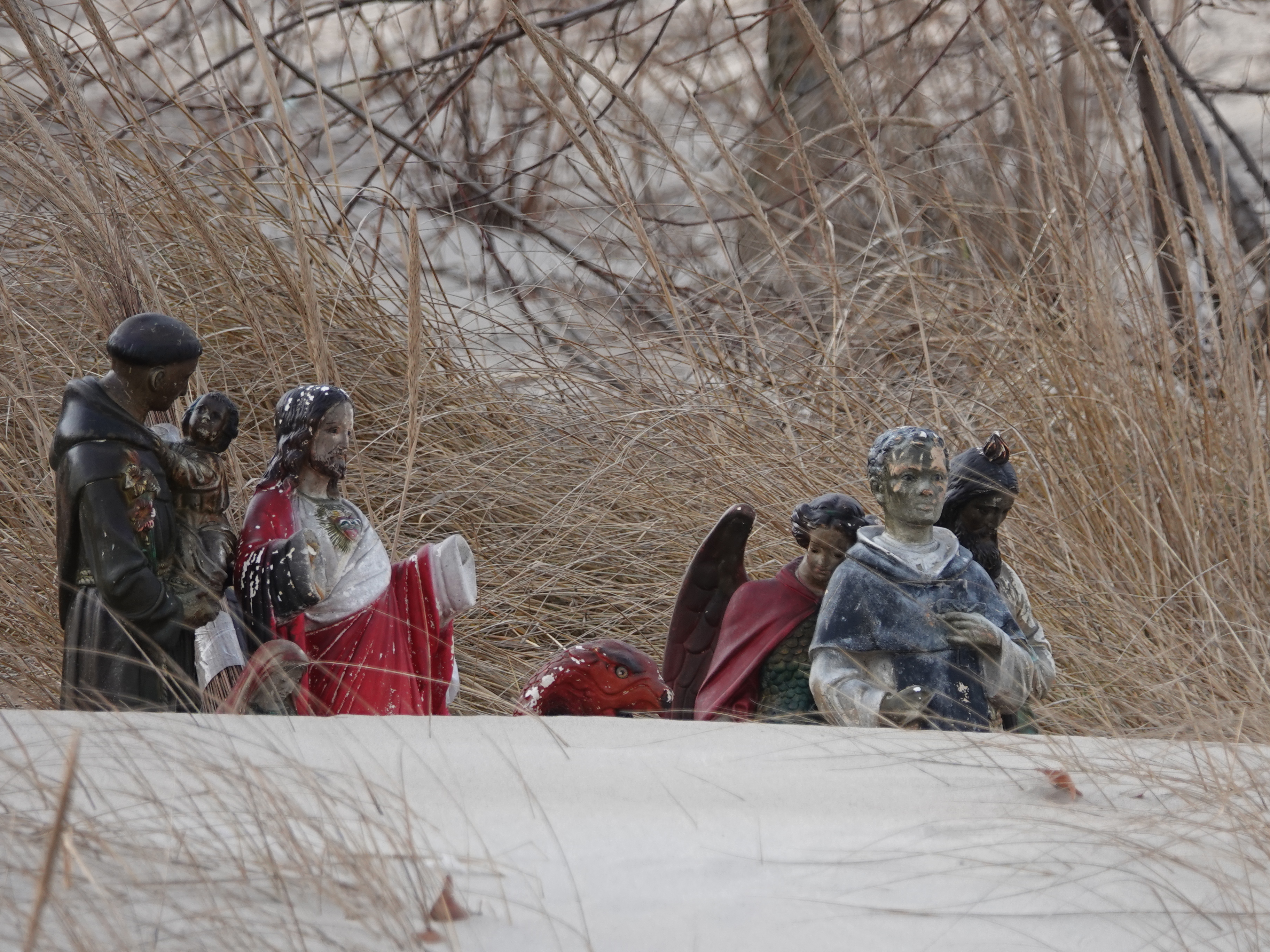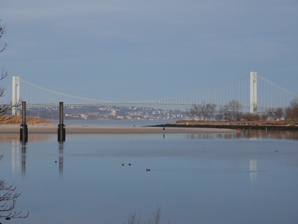 At low tide, you can walk around the western end of Coney Island. There’s also a lot more of Coney Island Creek Park, seen here from adjoining Kaiser Park, at low tide. Those posts are part of the ferry dock that isn’t. There were a couple homeless people’s fires in the dunes, filling the air with smoke. The city park ends somewhere around the bend to the left and the private, gated community of Sea Gate (developed by the rising president of the Royal Baking Powder Co. after 1888) begins. At the end of the Coney Island Boardwalk, on the south side, there’s a fence and posted signs cutting off the beach. Private property, however, only extends to the mean high tide line. Anyway, the western end of the former island of rabbits turns out to be rip-rap bulkhead, and if I hadn’t seen a dog-walker go that way I might have turned back. It’s called Norton’s Point on old maps; I could not see the lighthouse from down on the beach. All the houses waiting for the sea to claim them are higher up. I cautiously scrambled over the seaweed-slick rocks until I hit sandy beach again. It wouldn’t have been passable at high water. A rusty bulkhead looks like it’s already a reminder of an ancient civilization. A number of beach-front homes looked abandoned, presumably whacked by Sandy and never repaired–but brand new follies are still being built.