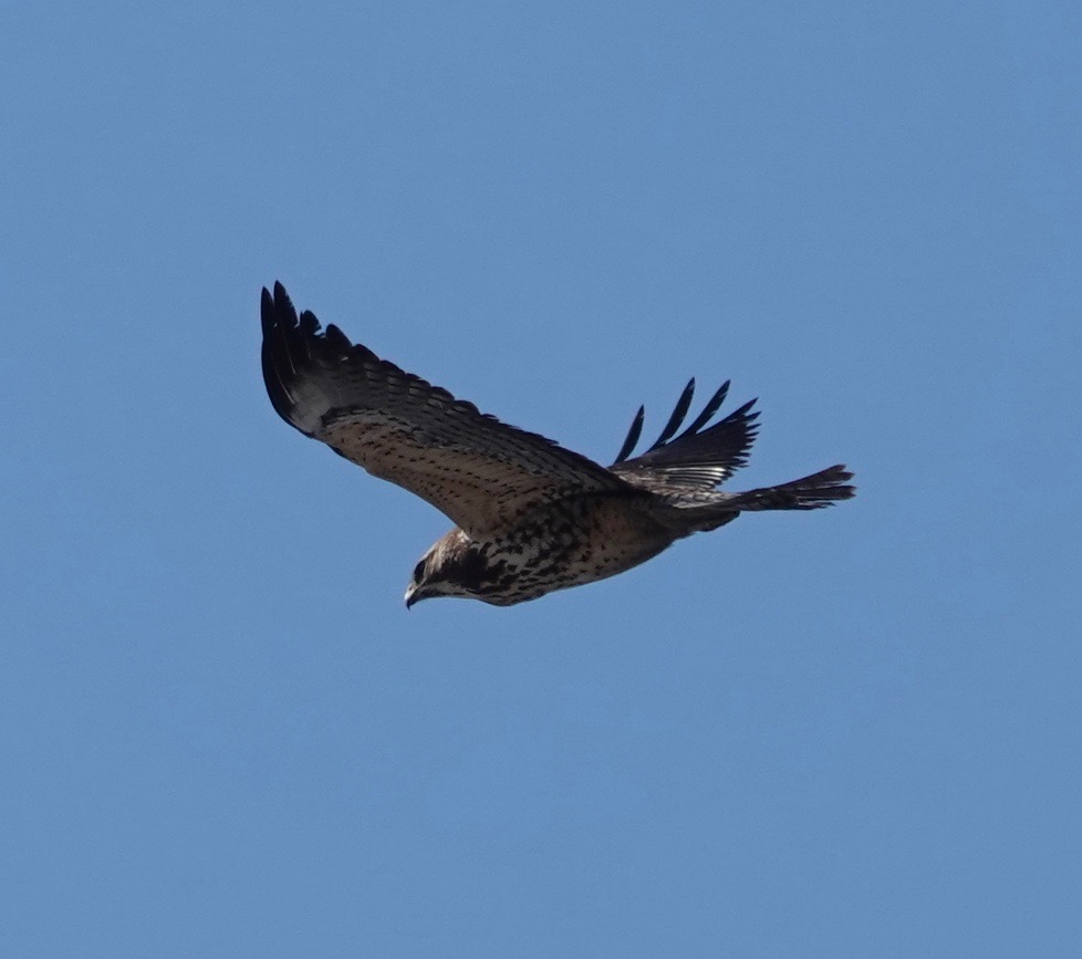 In bright sun, the view-screen of the camera is hard to see, so it wasn’t until I got home that I saw the detail here. This isn’t the expected Red-tailed Hawk.