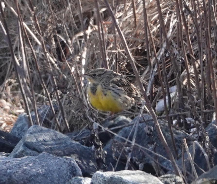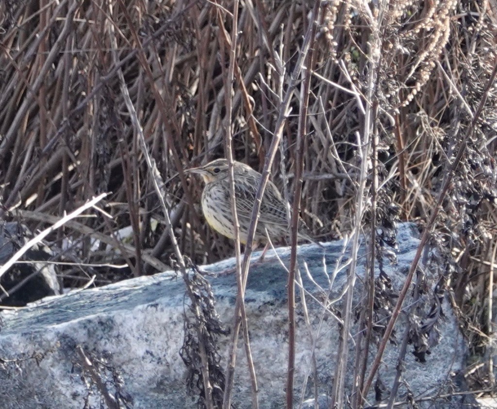 You can’t actually see the telling details in my pictures, but this is, by all accounts (dozens now on ebird), a Western Meadowlark (Sturnella neglecta). At Bush Terminal Park.