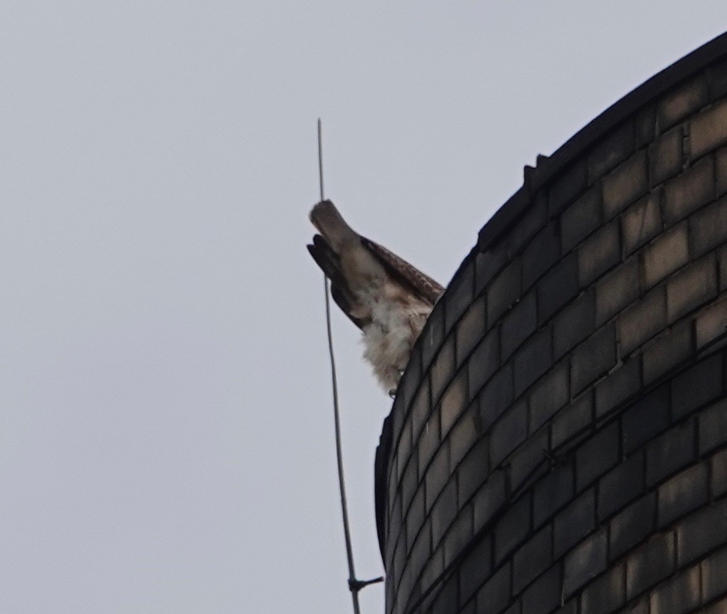Walking northwards on 2nd Avenue, as close as a civilian can get to the bay in this part of Sunset Park, this giant smokestack often has a perching raptor. This Red-tail had just excreted.