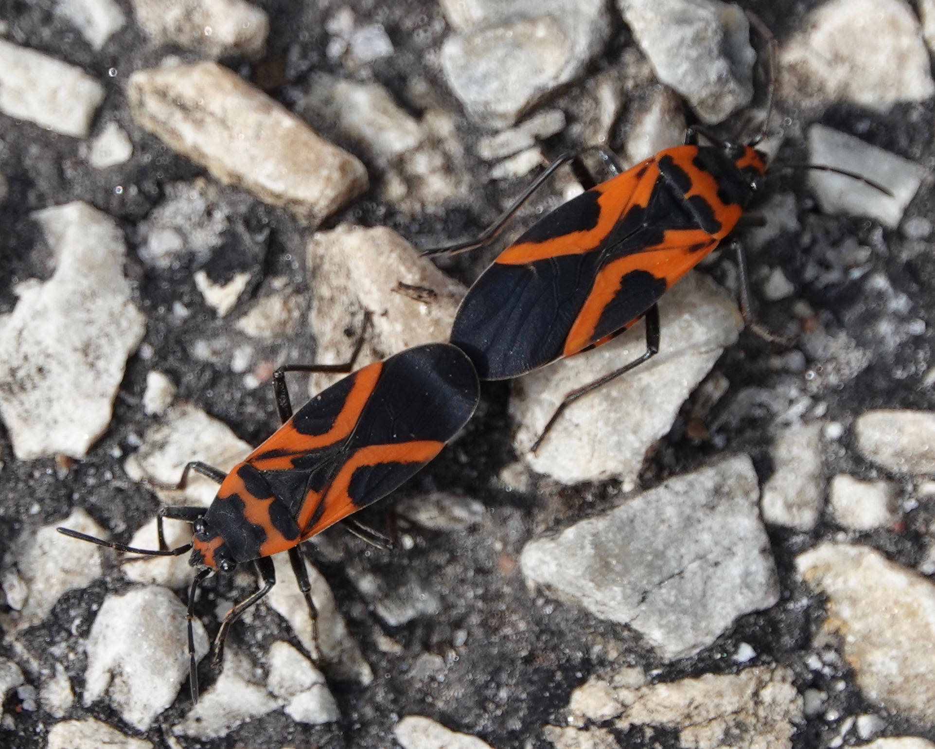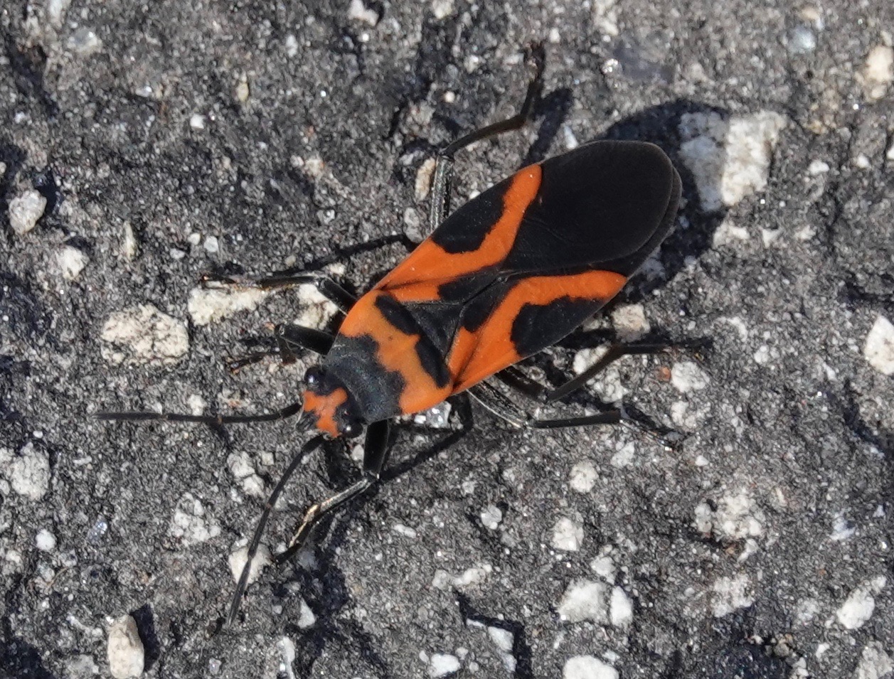 The False Milkweed Bug is so named because it once confused with the Small Milkweed Bug/Lygaeus kalmii, but it turned out to not feed on Milkweeds. False Sunflowers/Heliopsis helianthoides are their food of choice. Saw several a week ago at Brooklyn Bridge Park where False Sunflowers are planted, but… what are they feeding on this time of year??