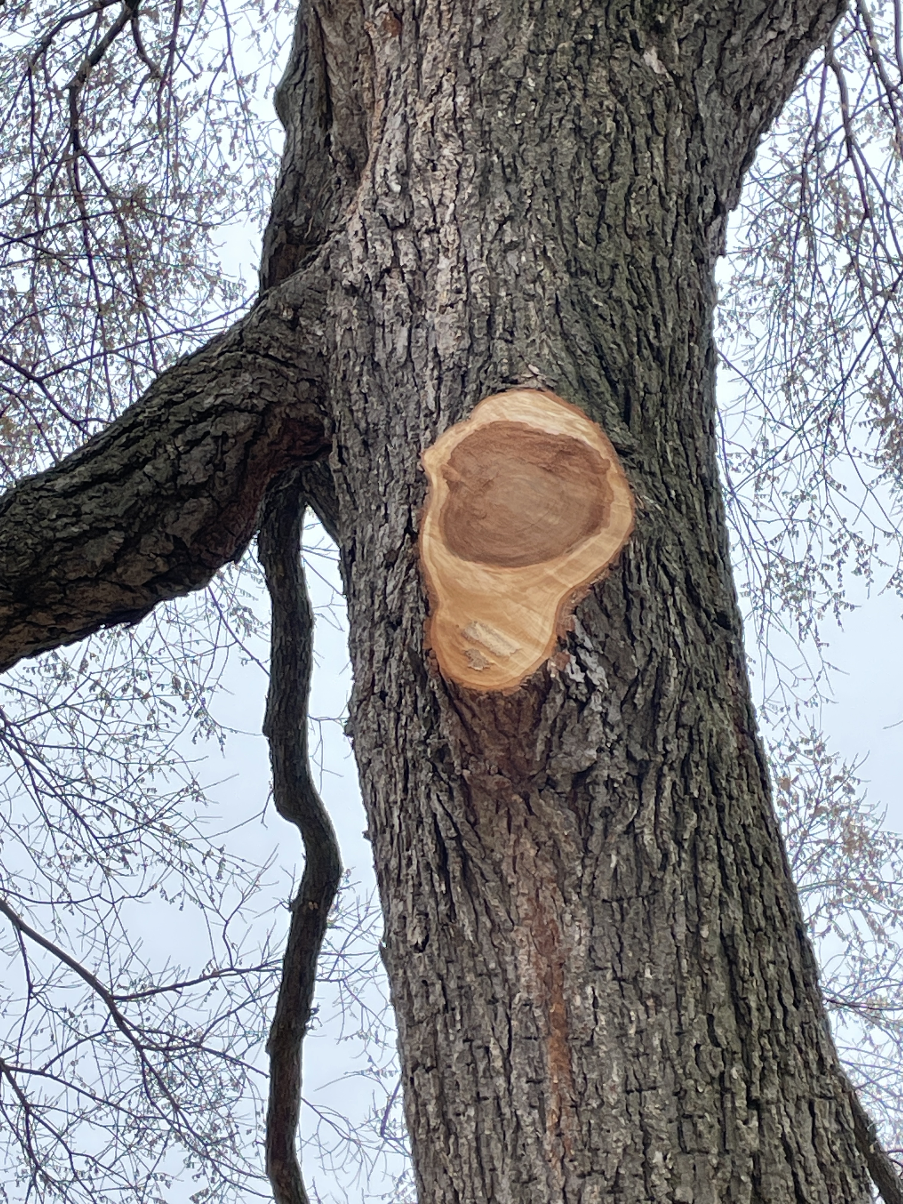 It was longer than the tree is tall. So low, people could easily hang from it, or hang their shit on it. (We love the city’s nature to pieces all the time, from the millions of gallons of dog piss in tree pits to voracious “foragers” trampling over everything to get that mushroom.) I don’t know if it was a structural problem or the fear of a structural problem behind the excising of this limb.