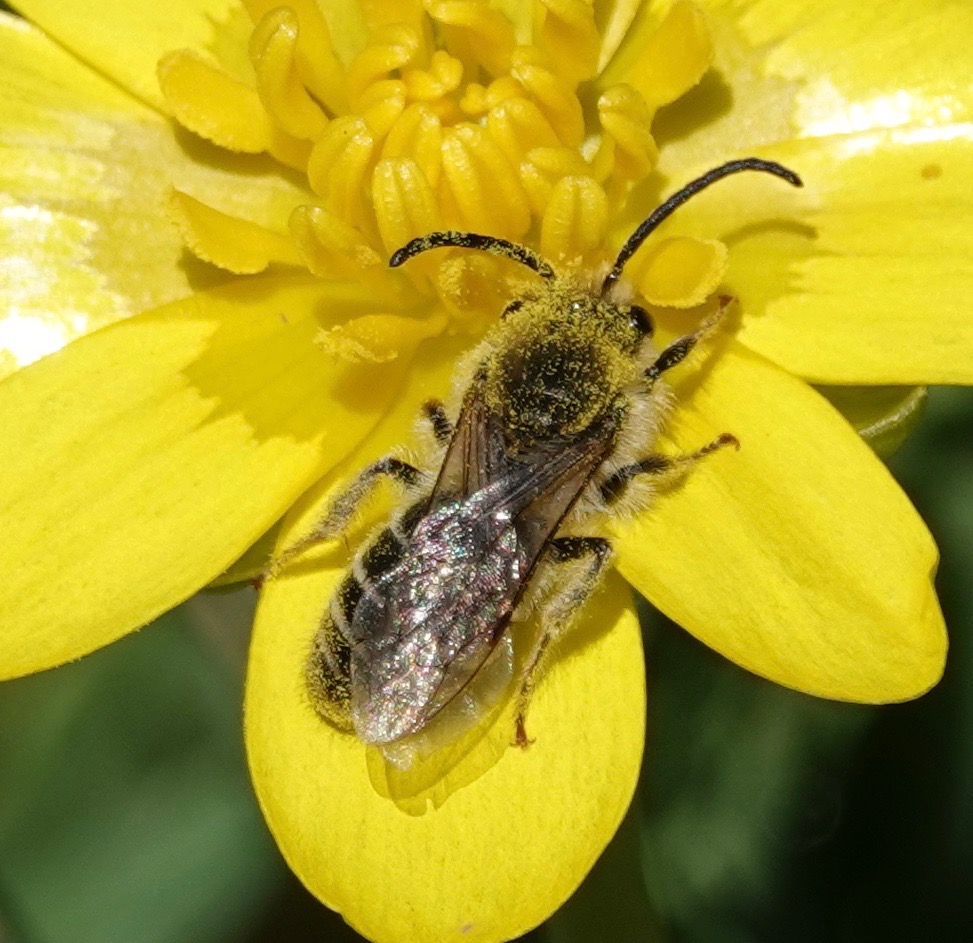 On Dandelion/Taraxacum. (These pollen-drenched visitors to a couple yellow flowers were photographed 3/26.)