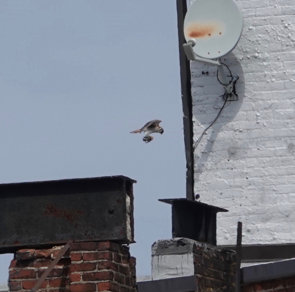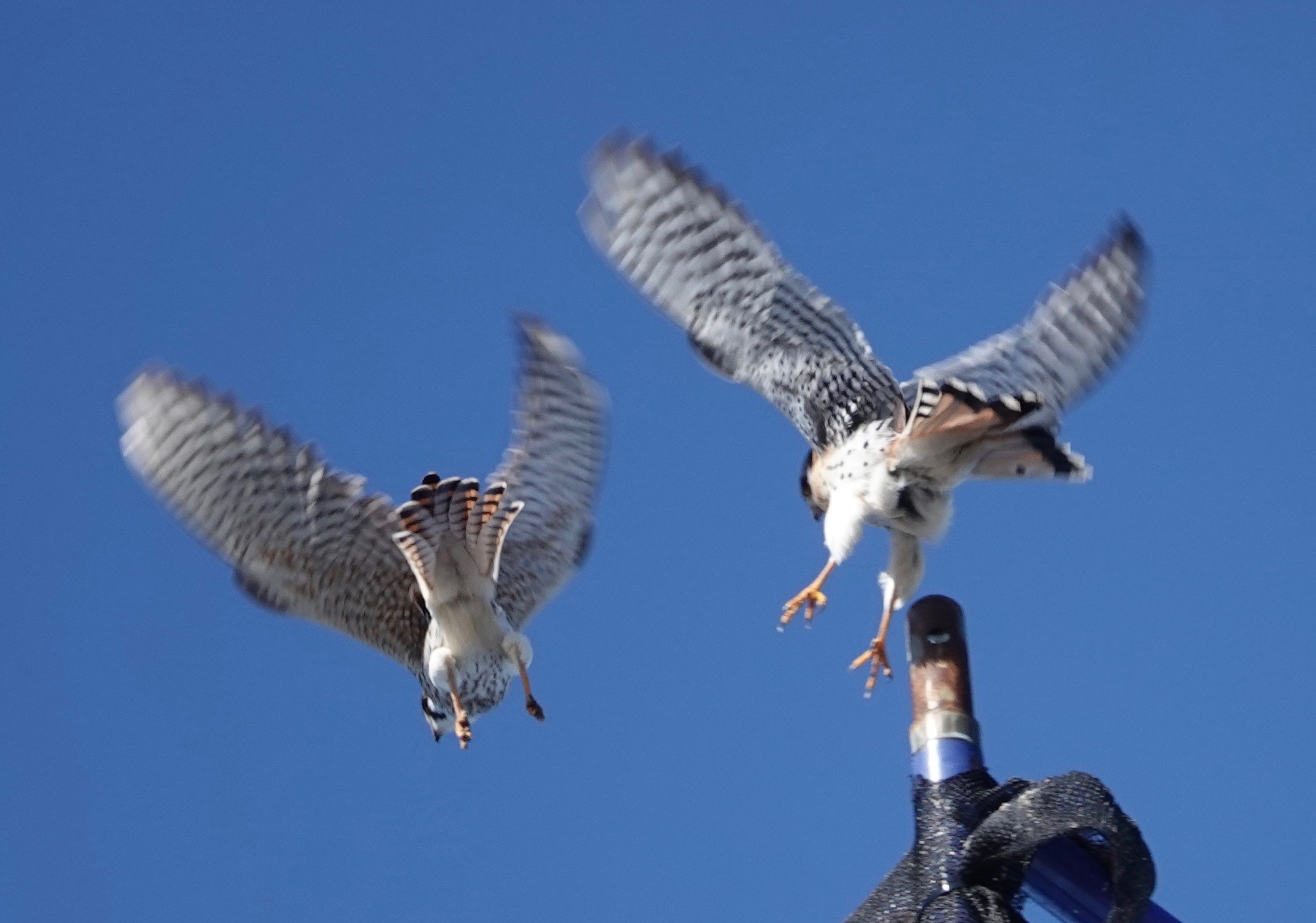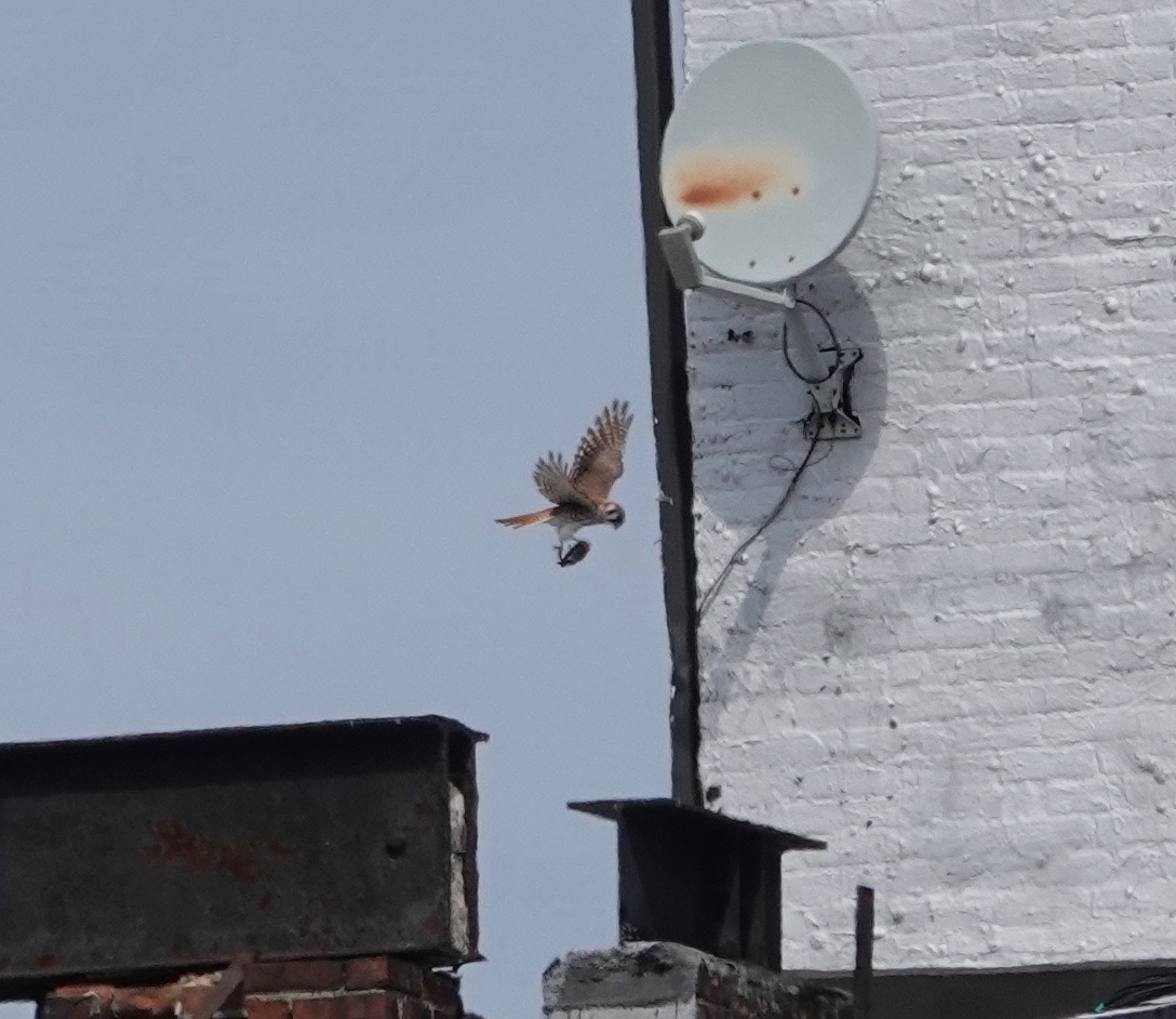 There were sightings of an American Kestrel female all winter from the apartment, but in the last month she’s only been spotted once. About 10 blocks and two avenues away, however, I’ve lately come across a pair in courtship.