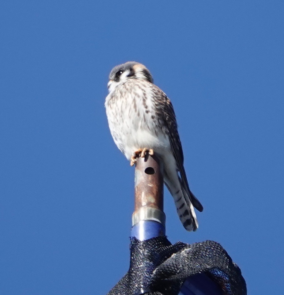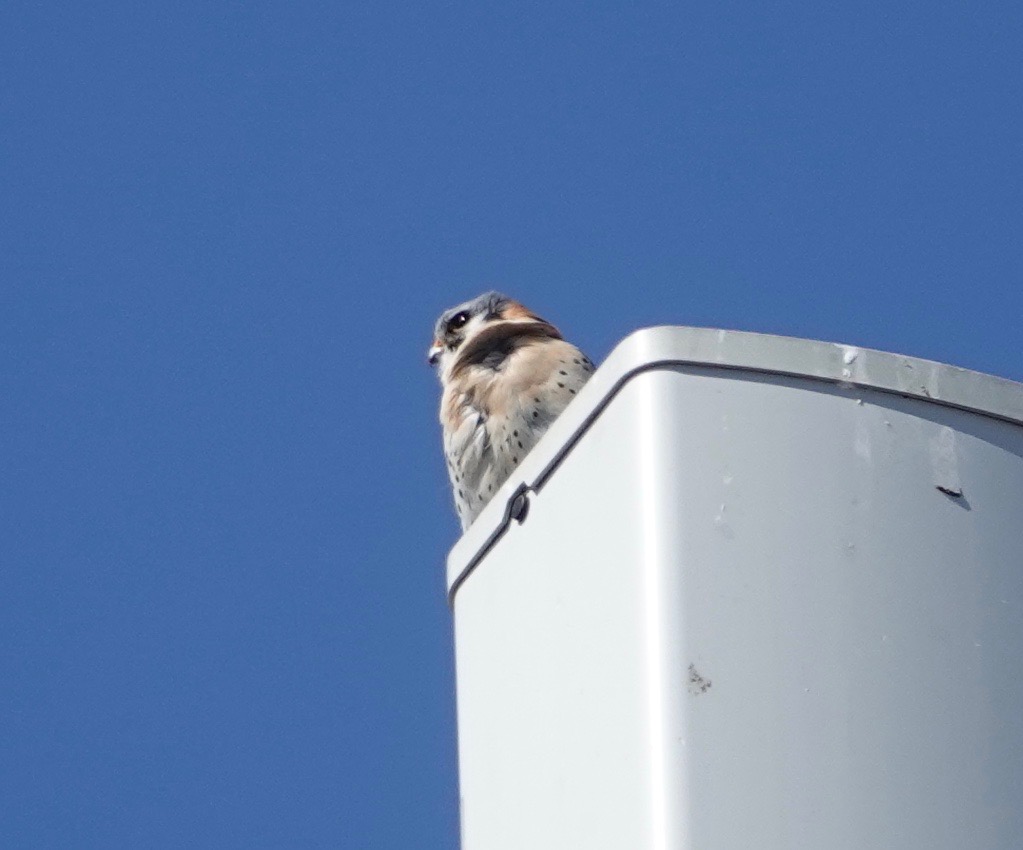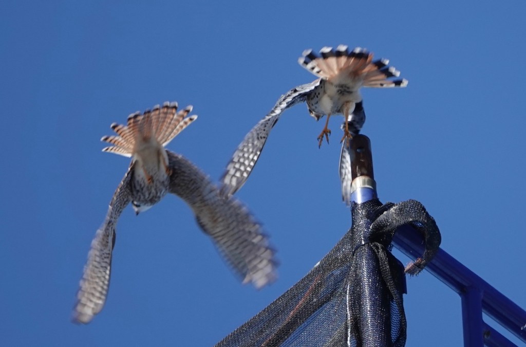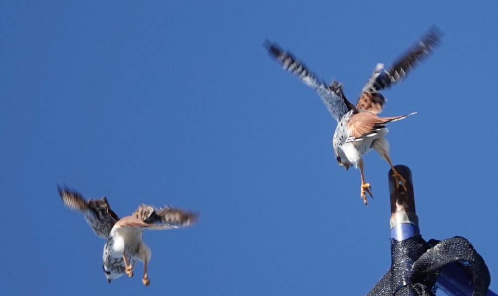 There were sightings of an American Kestrel female all winter from the apartment, but in the last month she’s only been spotted once. About 10 blocks and two avenues away, however, I’ve lately come across a pair in courtship.