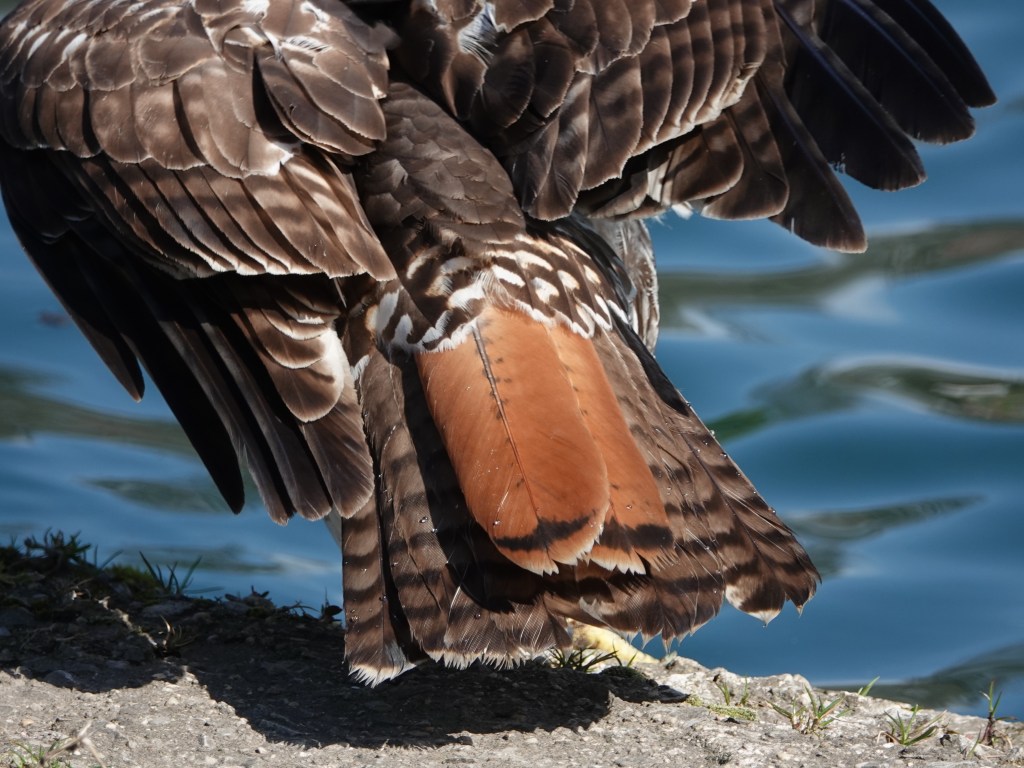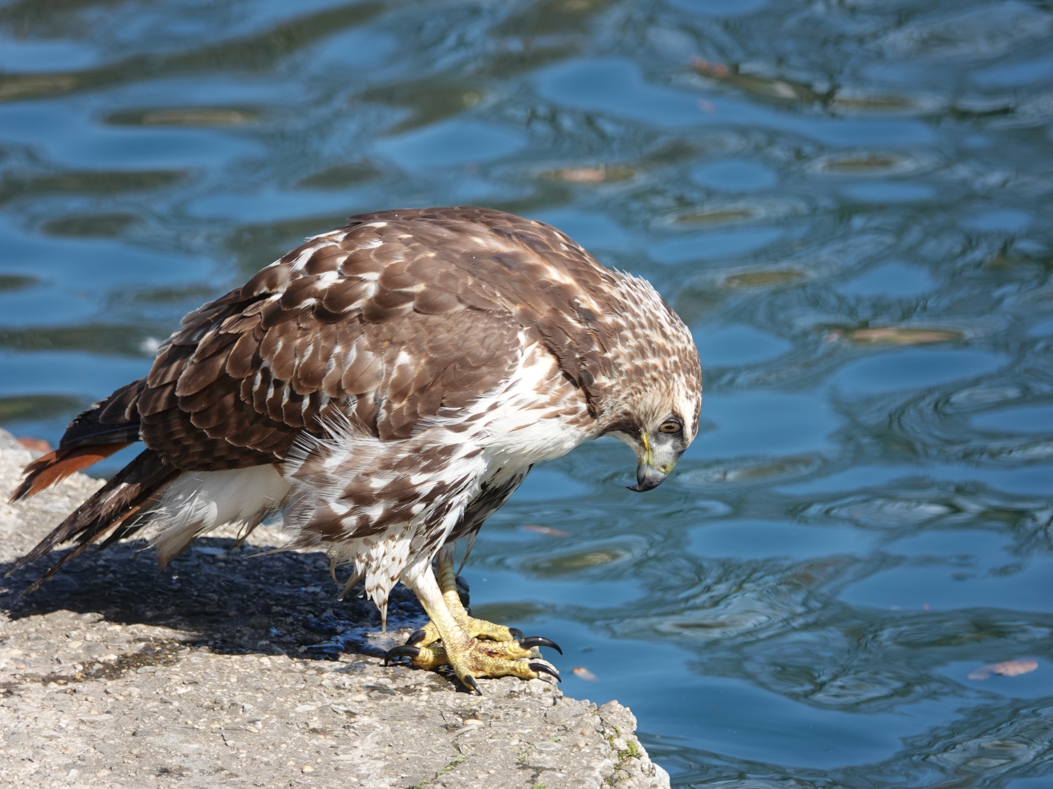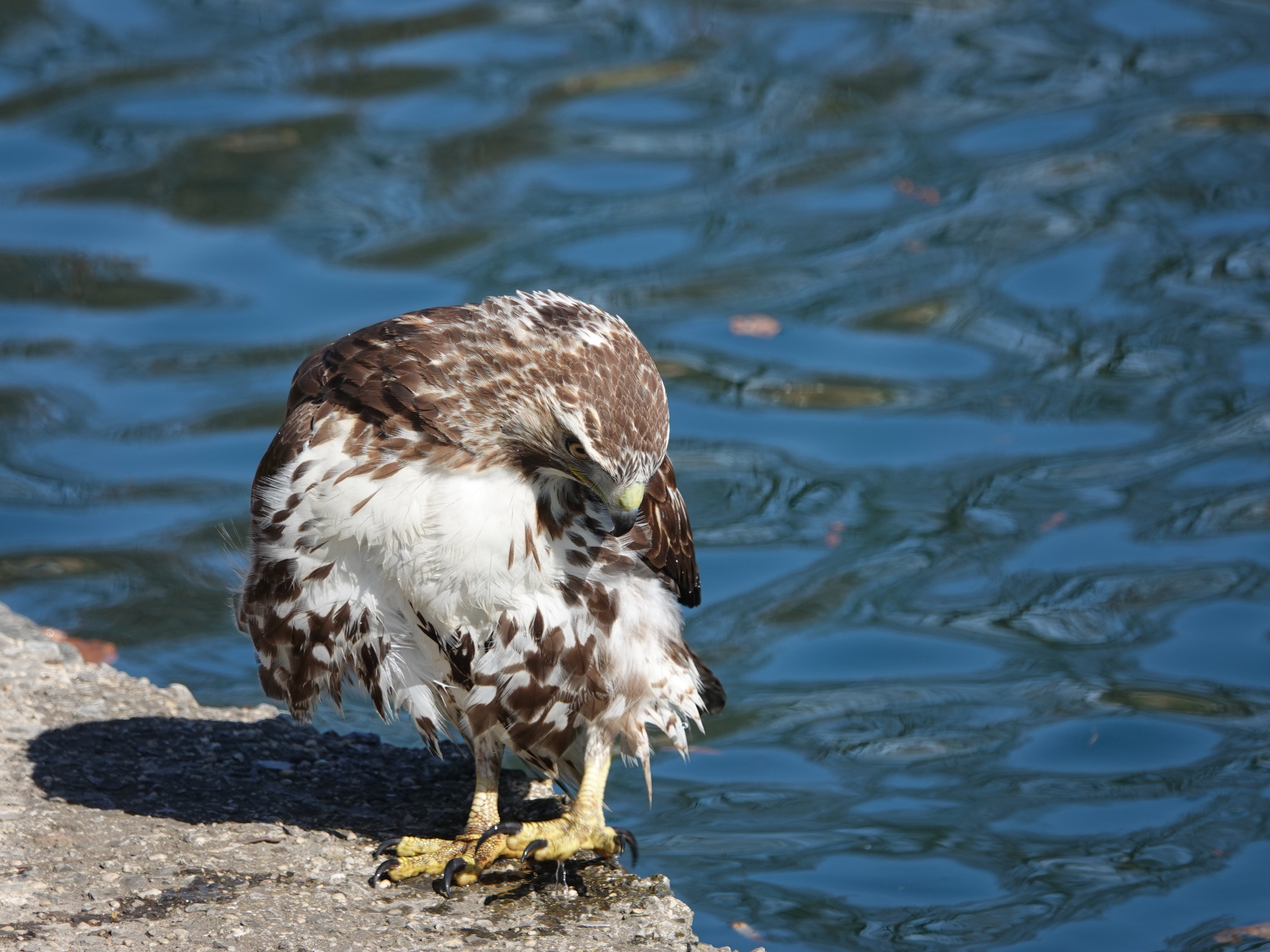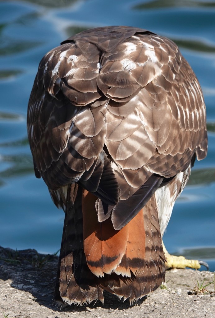 Bathing is really important for birds, but the problem is where. From the blog command center, we see birds bathing in roof puddles and what are obviously backed-up gutters. A pond seems like a good possibility, but this one is walled in: the drop off is deep. This Red-tailed Hawk was long considering strategy here.
