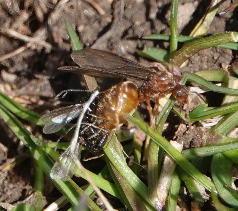Once her nuptial flight is done, she sheds her wings and goes back underground. The males, called drones, will die soon after all this aerial and ground frenzy. As their common name suggests, this species actually likes it cold, and goes into hibernation-like aestivation in summer, but their mating flights have been on the warmish days during the last weeks.