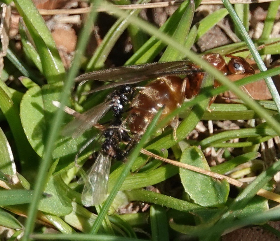 Some American Winter Ants/Prenolepis imparis attempting to reproduce. The female is much, much larger than the males. Two or three came down to the ground with her, but only one got to connect: