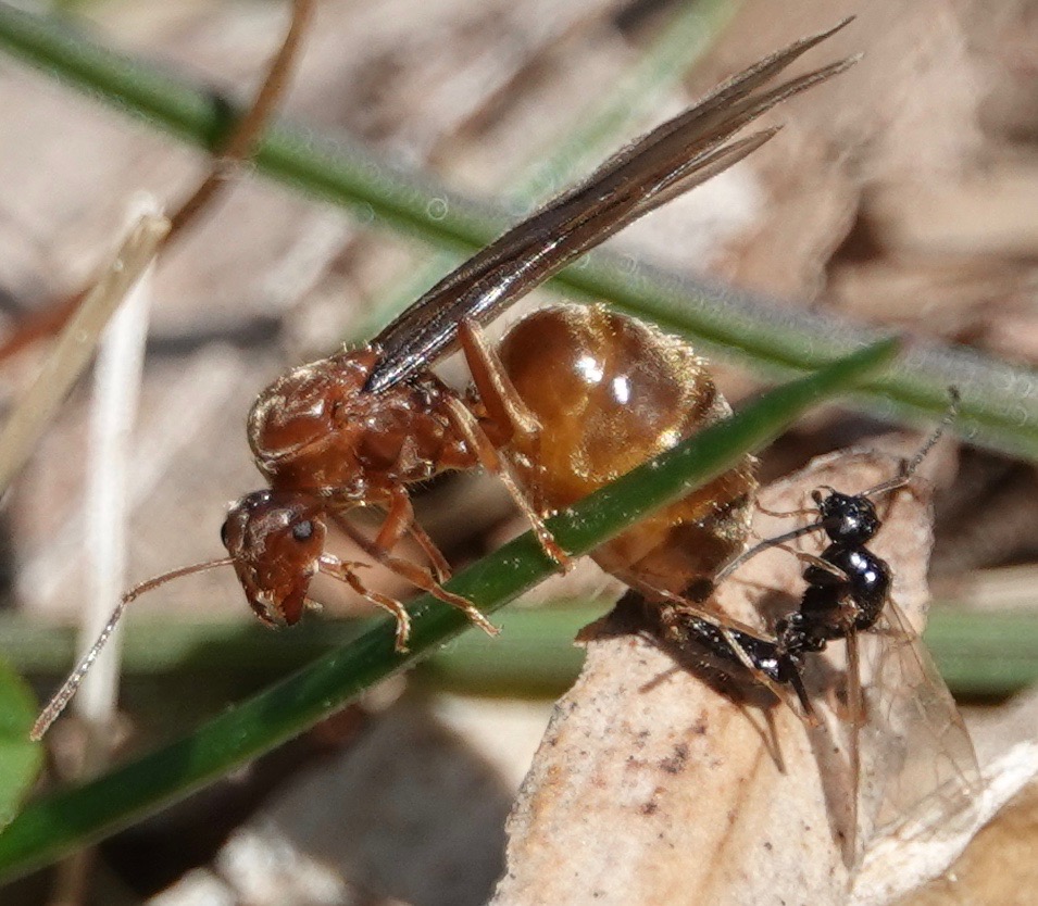 Some American Winter Ants/Prenolepis imparis attempting to reproduce. The female is much, much larger than the males. Two or three came down to the ground with her, but only one got to connect: