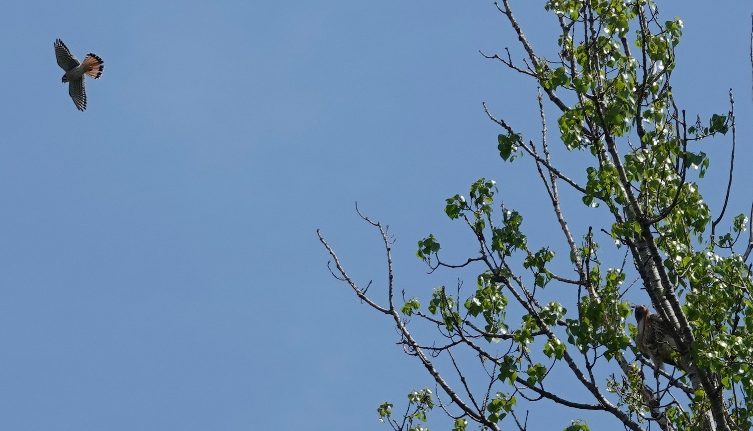 A Red-tailed Hawk glides down down with its wings hunched up. I though it was a plastic bag in the air at first. Then it landed in this Eastern Cottonwood and voila, the local American Kestrel male let up a war-cry and came calling.
