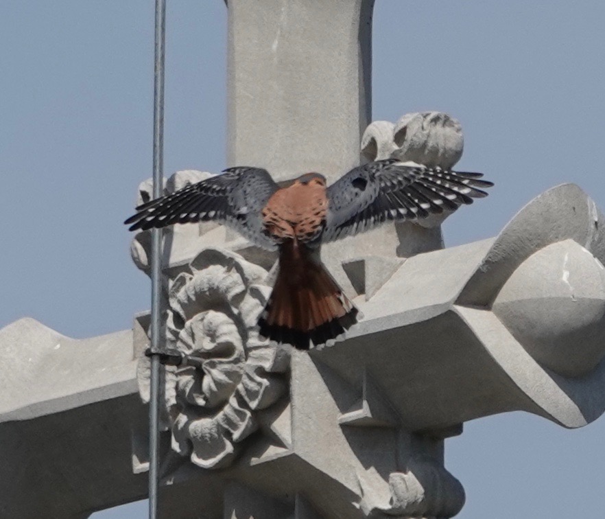 I don’t know if this is the same male, seen several days earlier some 15 blocks away. One day this spring, I spied a pair of American Kestrel copulating on St. Michael’s at 4th and 42nd St and quickly swung my scope over to 4th and 32nd, where there’s a Kestrel nest this year. At least one bird was visible there. So potentially two pairs in the immediate area.