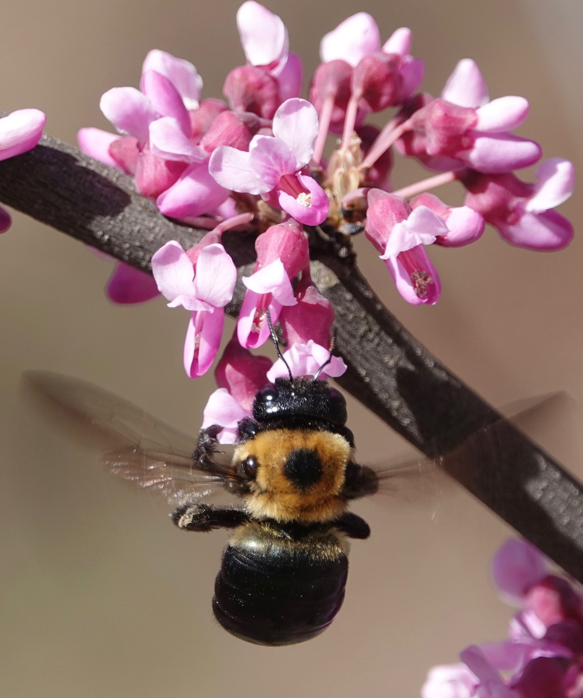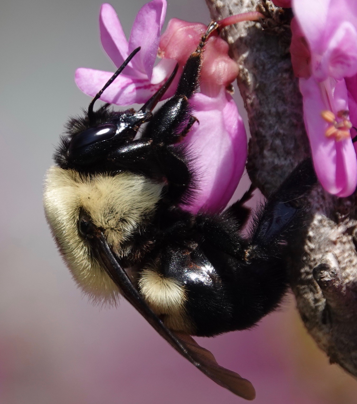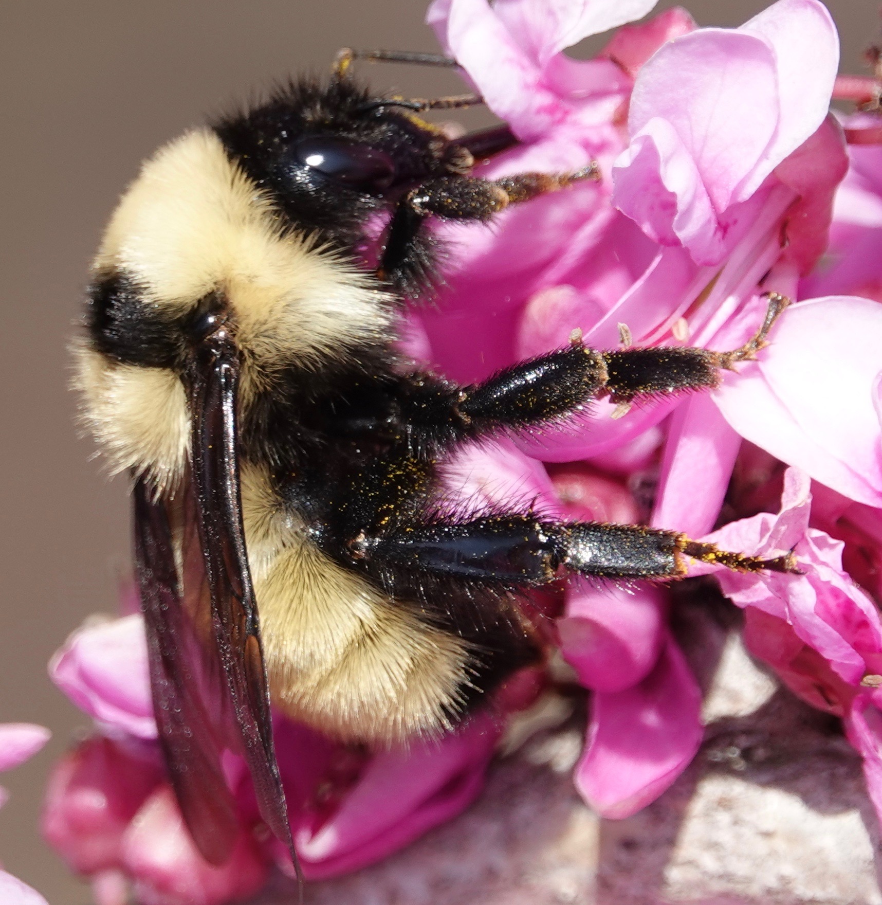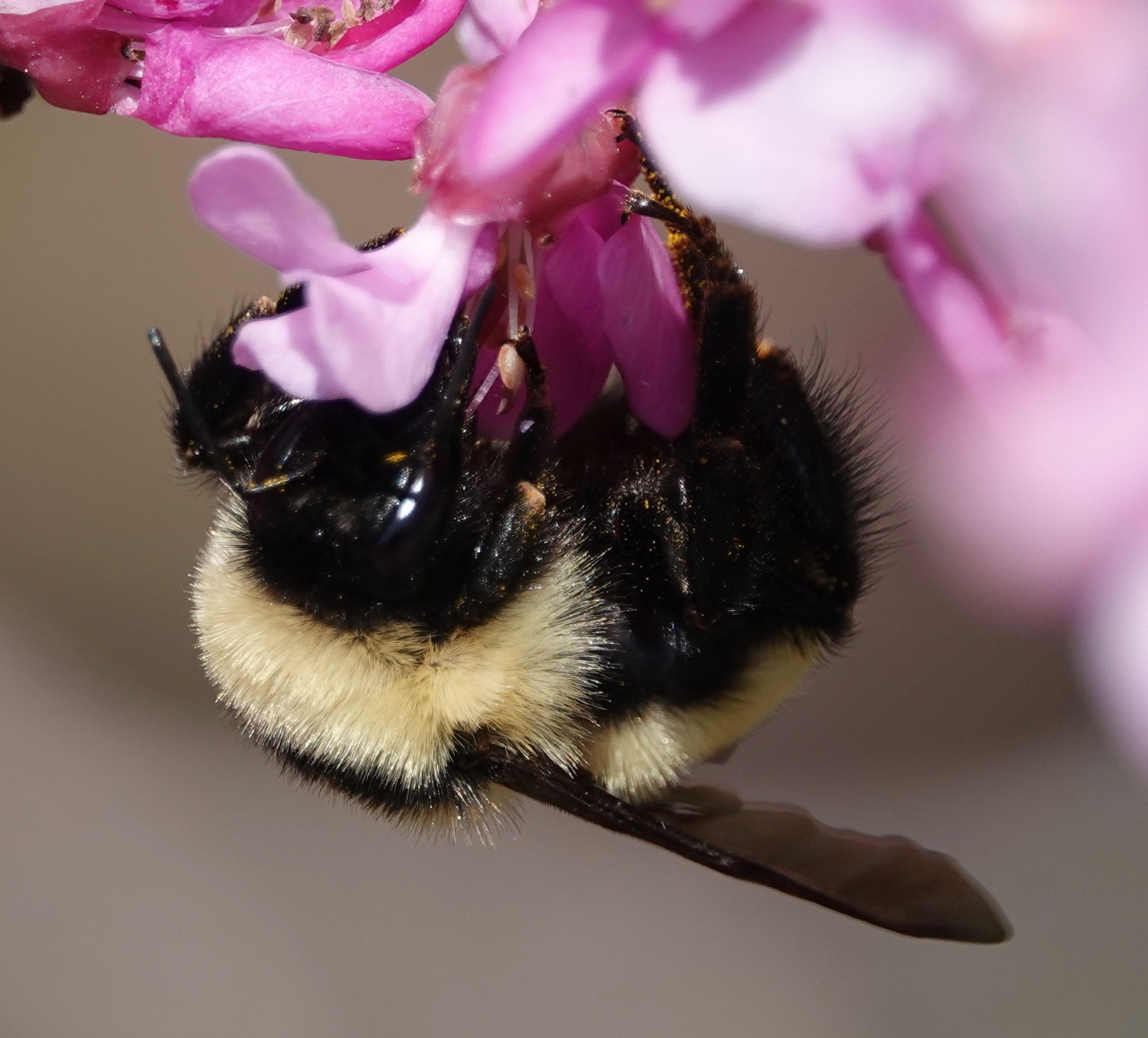 The small, legume-family (Fabaceae) flowers of Eastern Redbud (Cercis canadensis) are nectar mines. Here’s a long-tongued Golden Northern Bumble (Bombus fervidus) going for the gusto.