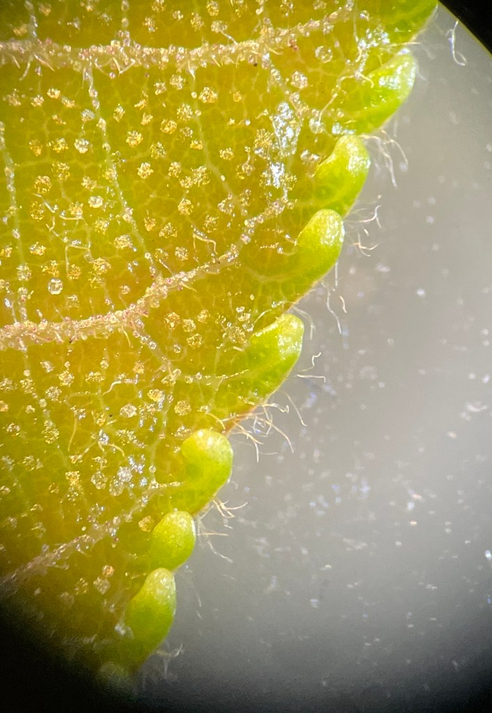 Look at plants through various magnifications (10x in the above pic), and you start see a lot of hair. As it happens, this is the underside of a fresh Mockernut Hickory leaflet. These are particularly hairy; in fact, Carya tomentosa is named for its leaflet undersides being covered in dense short hairs (from the Latin tomentum). Those are some kind of aphids at work.