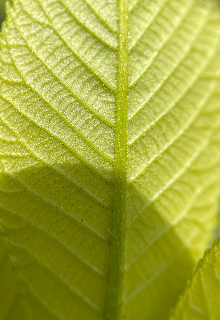 Now, for comparison’s sake, here’s the underside of newly emerged leaflet of Pignut Hickory/Carya glabra. Glabra means hairless or smooth.