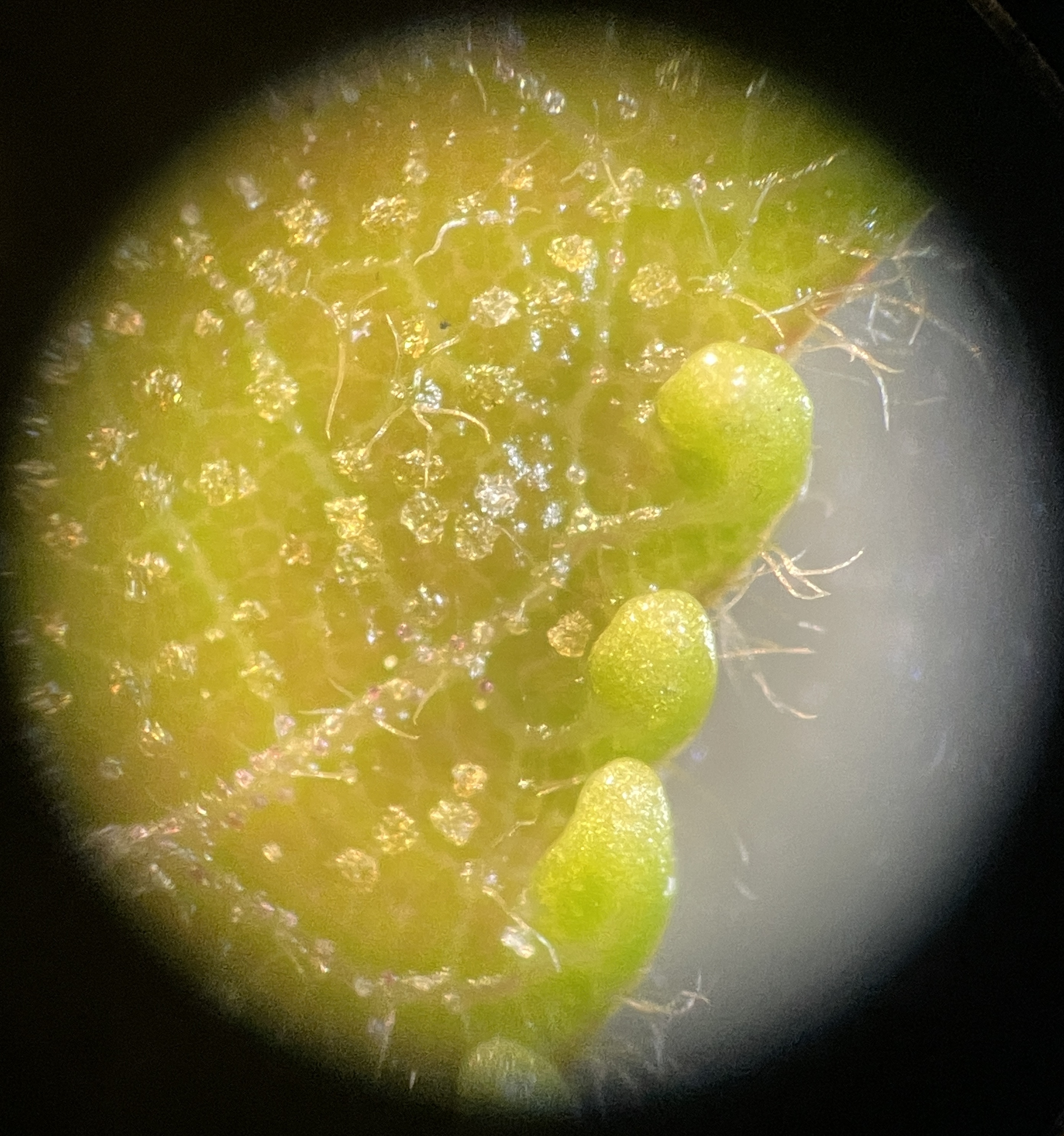 Look at plants through various magnifications (10x in the above pic), and you start see a lot of hair. As it happens, this is the underside of a fresh Mockernut Hickory leaflet. These are particularly hairy; in fact, Carya tomentosa is named for its leaflet undersides being covered in dense short hairs (from the Latin tomentum). Those are some kind of aphids at work.