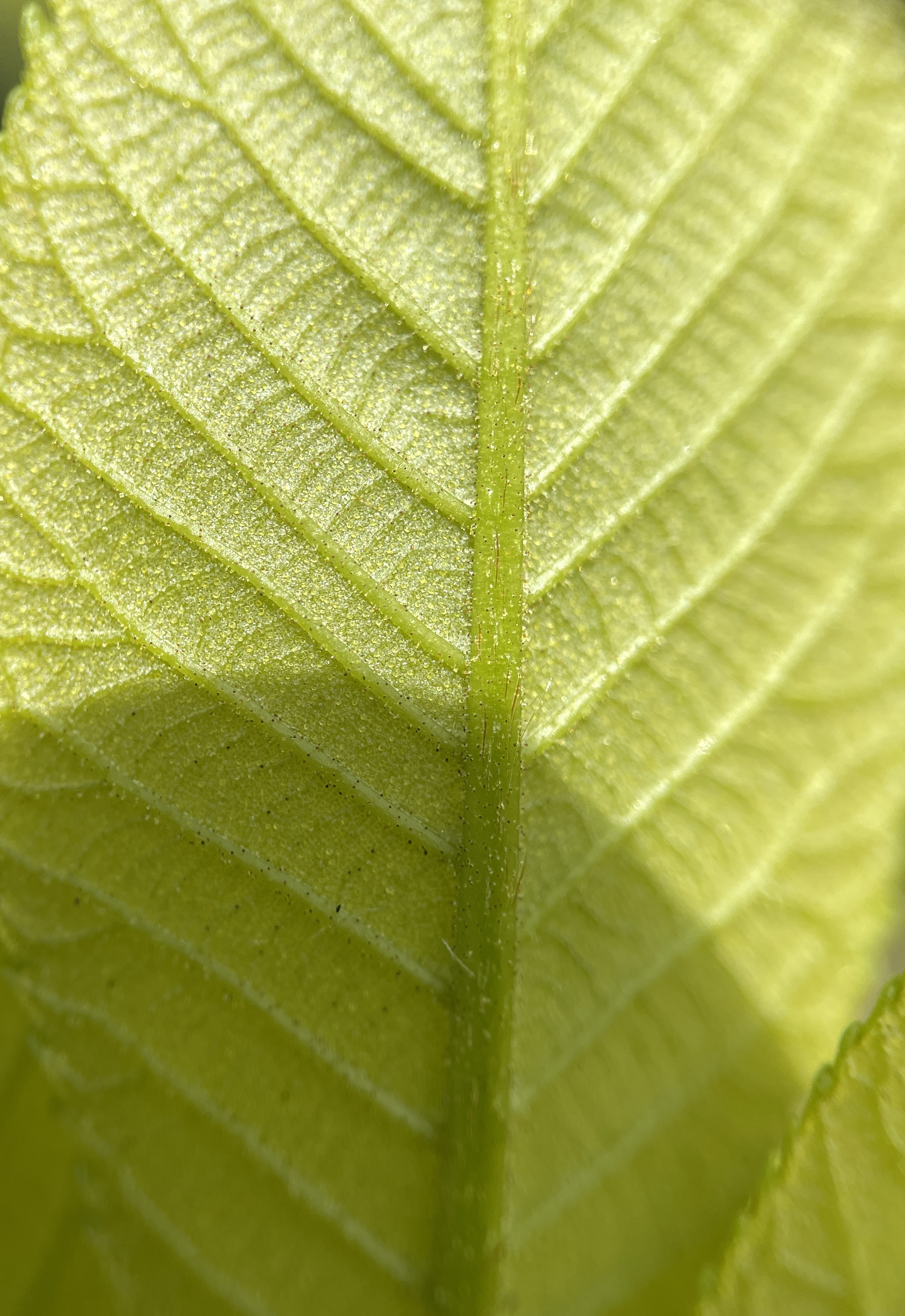 Now, for comparison’s sake, here’s the underside of newly emerged leaflet of Pignut Hickory/Carya glabra. Glabra means hairless or smooth.
