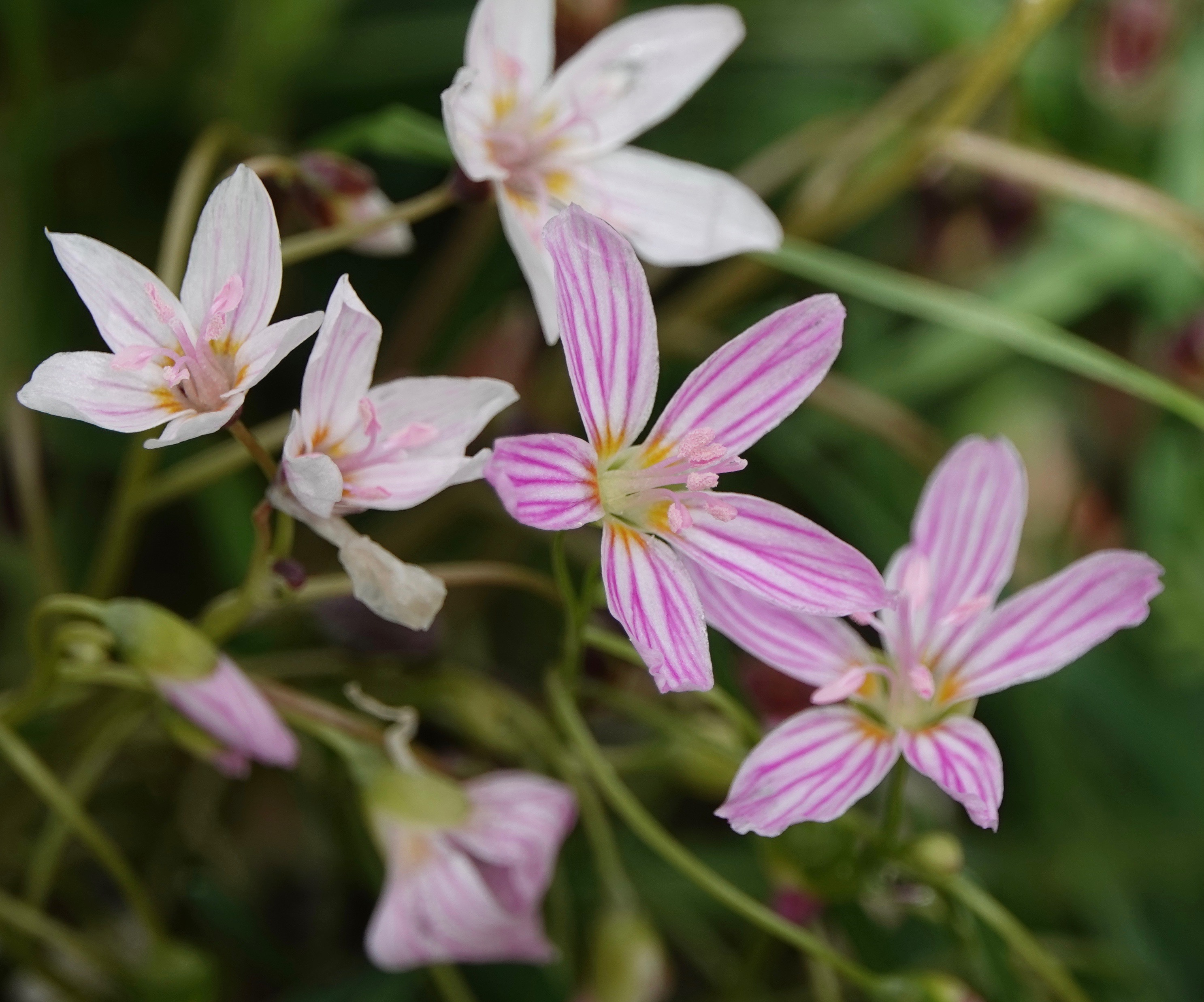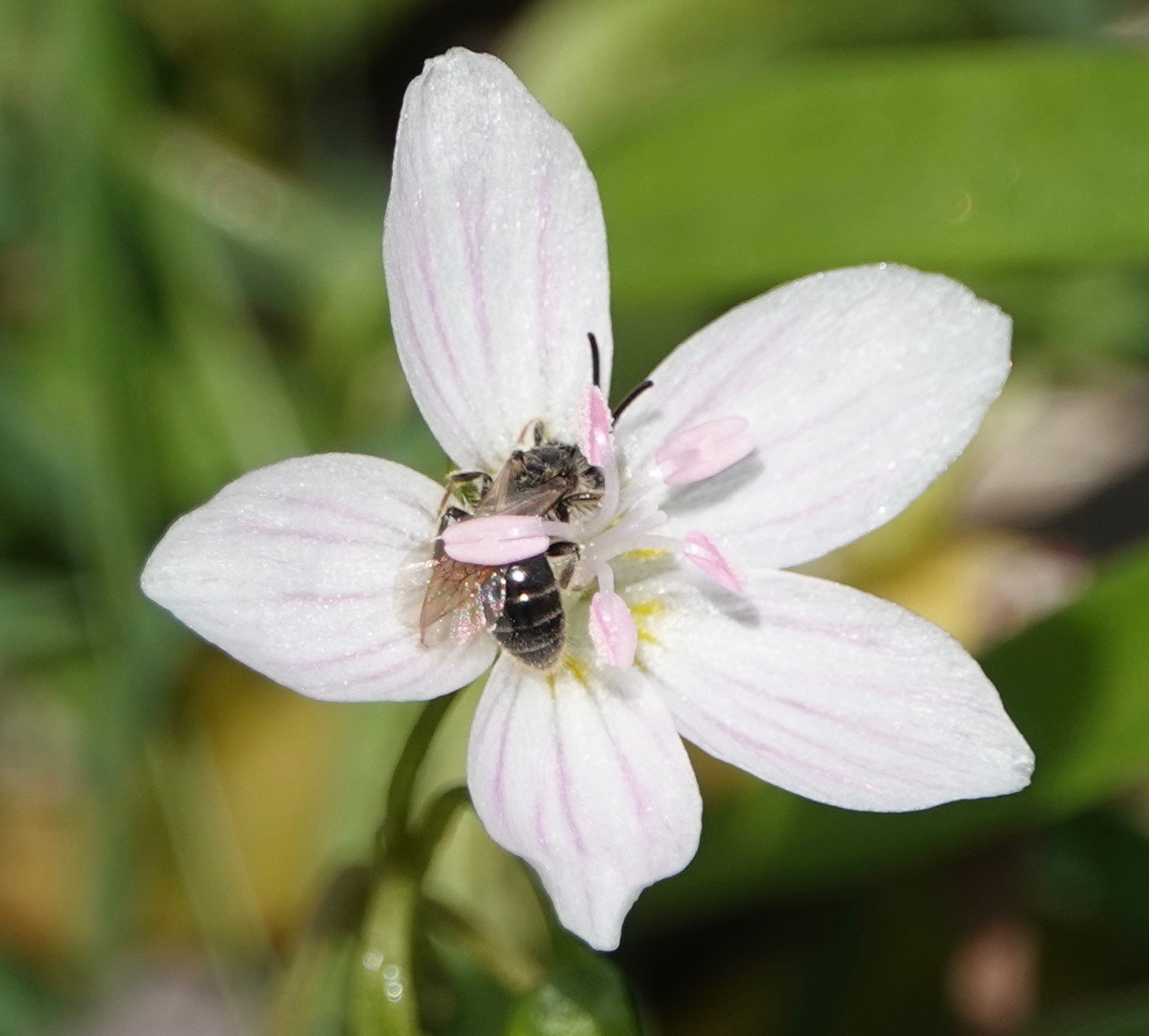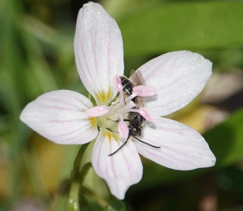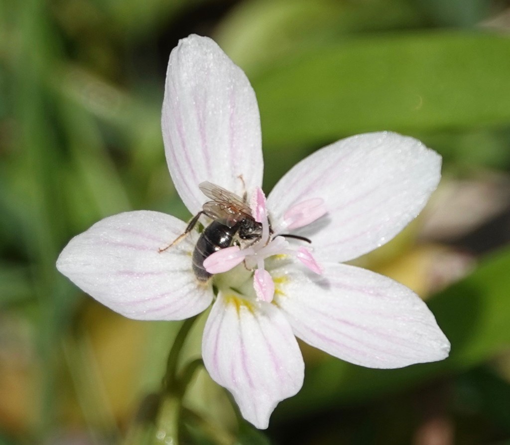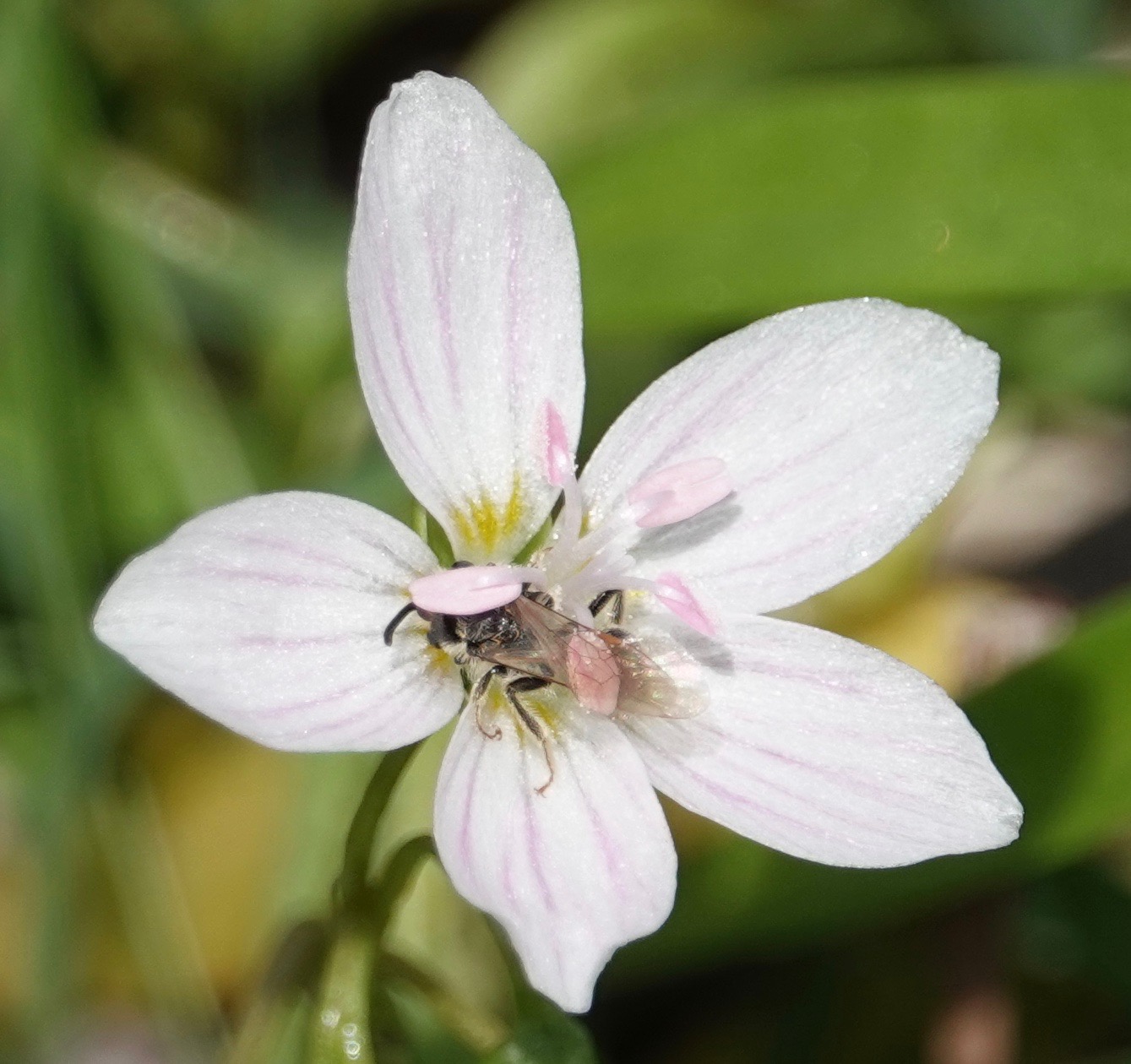 Lots of Virginia Spring Beauties/Claytonia virginica, including some intensely pink ones. After a stormy night, with temps rising into the 60s, there was a little bit of pollination going on.