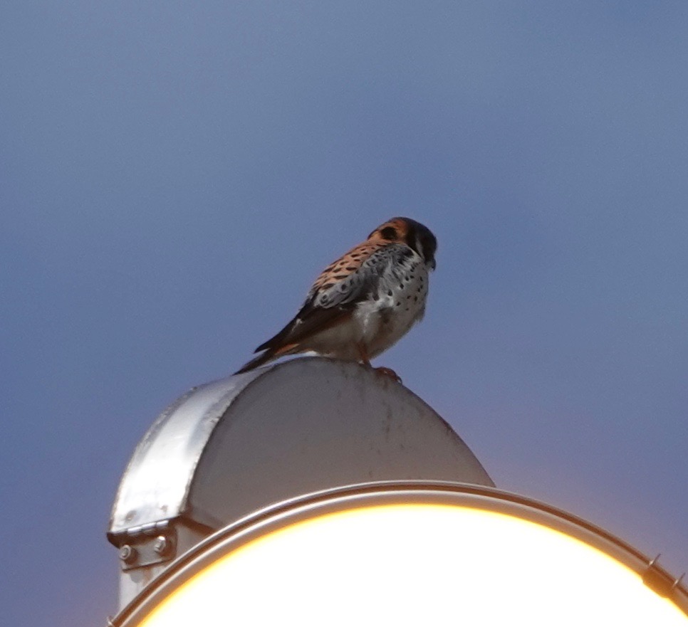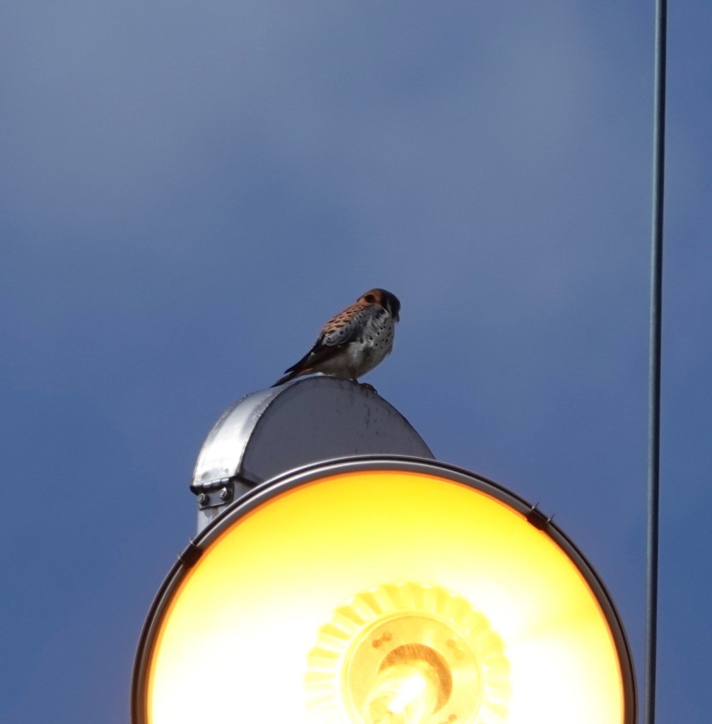 These are the infernal train yard lights my neighbors complain about. About three blocks away from the vast subway yard, they require blackout curtains to stop the glow. (We face a different direction, thankfully.) This light tower with a male American Kestrel atop it was on a distant part of the yard. Along with the very high fence, such lights are part of the elaborate and costly security to keep the subway graffiti-free.