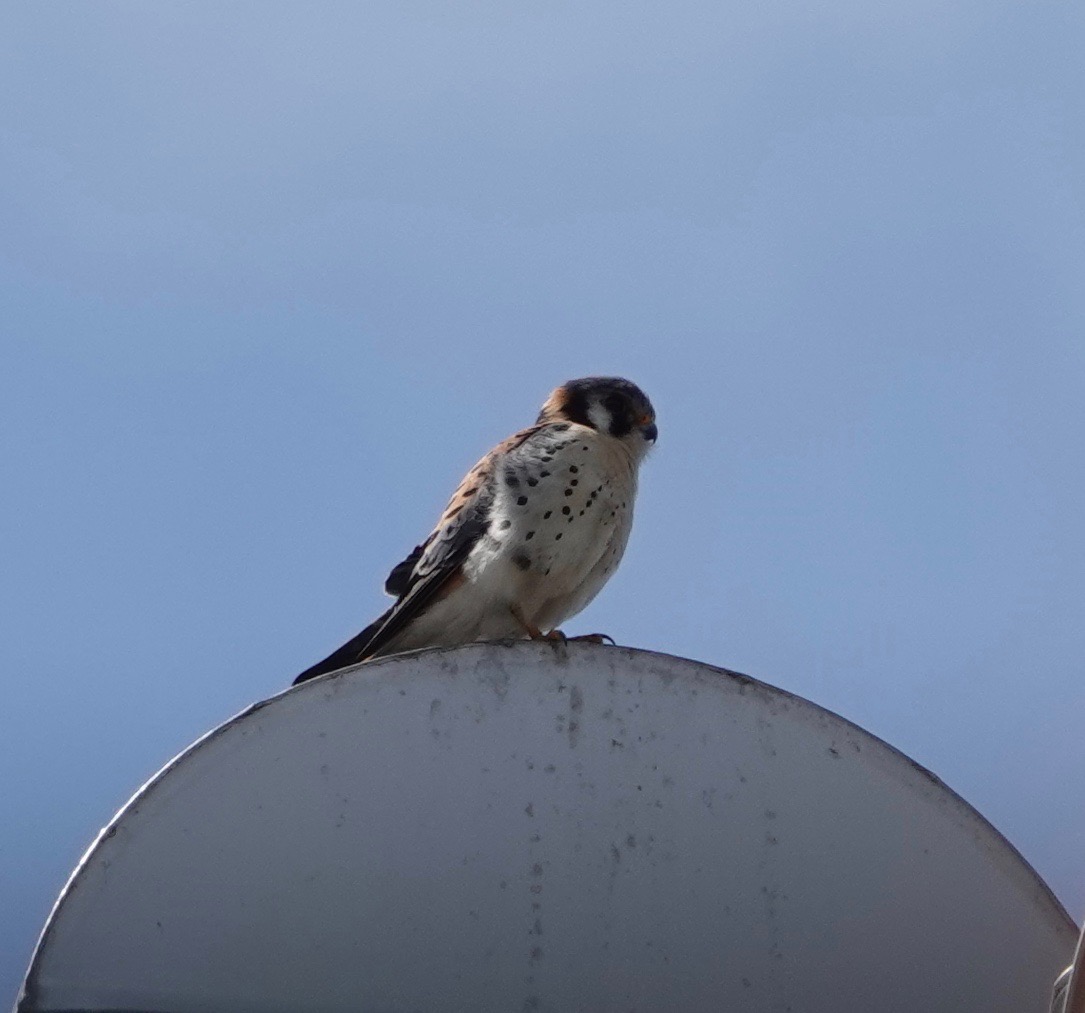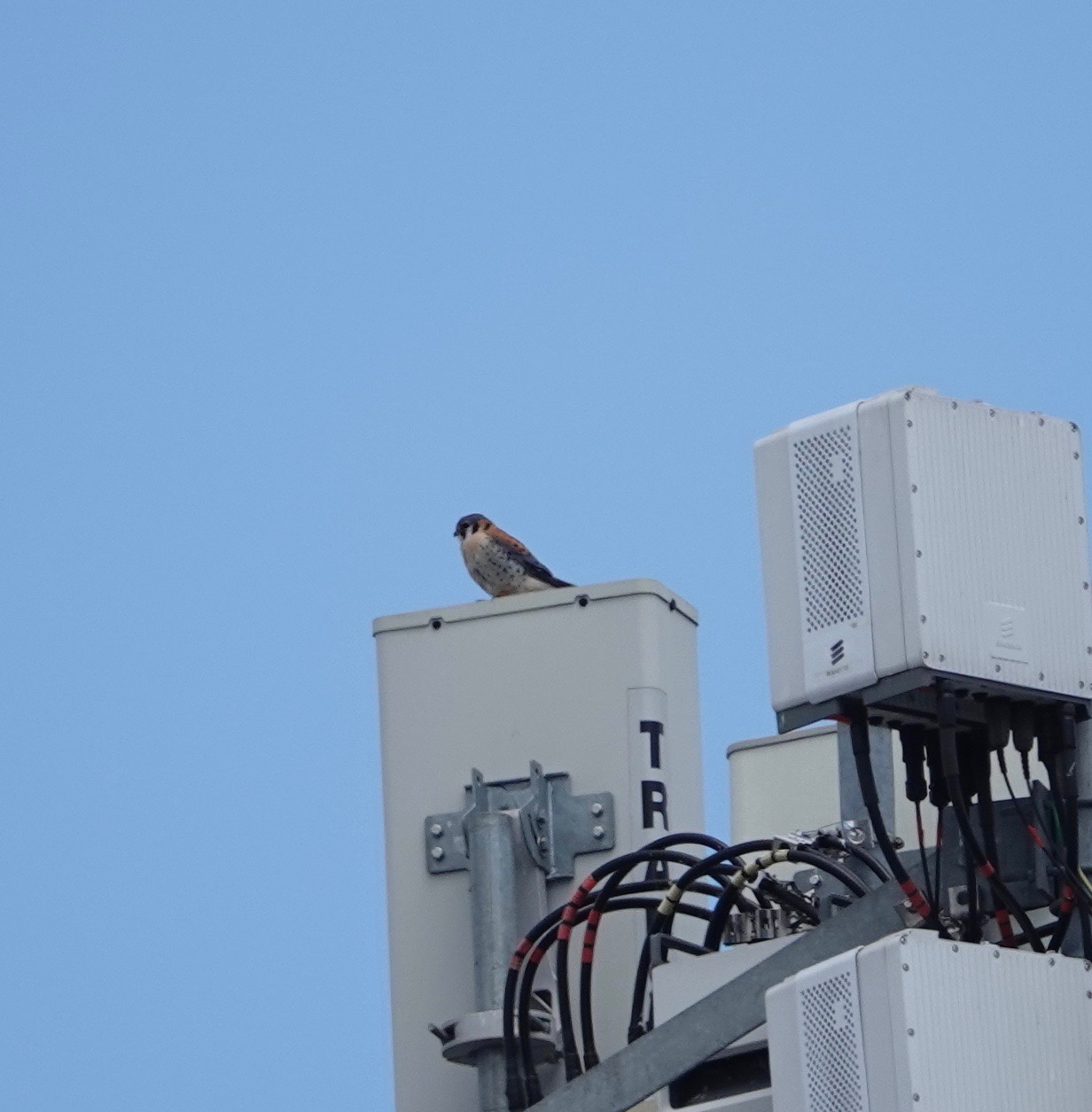 These are the infernal train yard lights my neighbors complain about. About three blocks away from the vast subway yard, they require blackout curtains to stop the glow. (We face a different direction, thankfully.) This light tower with a male American Kestrel atop it was on a distant part of the yard. Along with the very high fence, such lights are part of the elaborate and costly security to keep the subway graffiti-free.