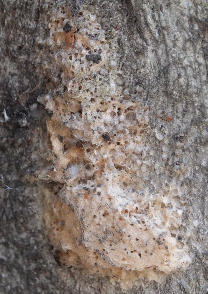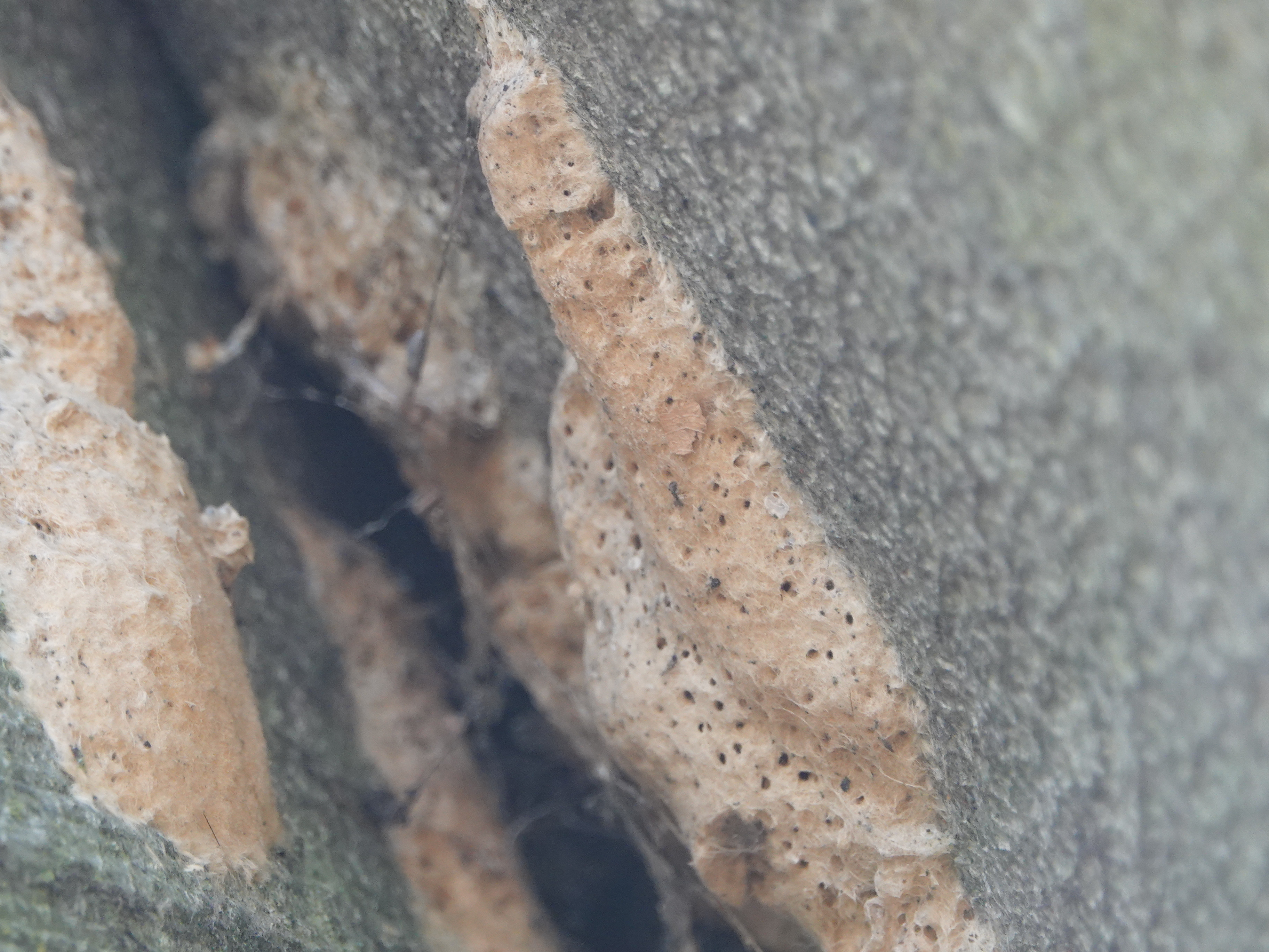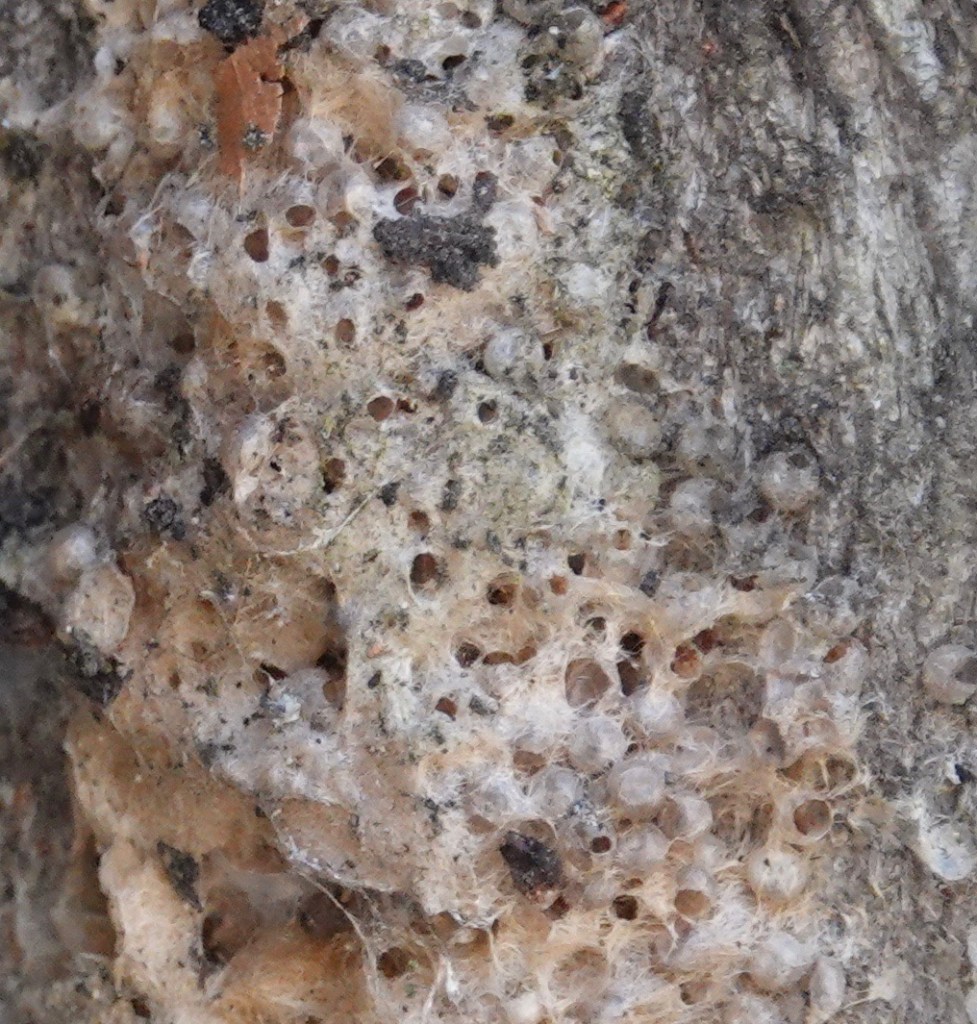 If you look closely, you can see the eggs underneath the foamy, spongy covering Spongy Moths/Lymantria dispar coat their egg-masses with. These used to be known as Gypsy Moths, but the common name was changed a couple years ago for obvious reasons. They were introduced to the U.S. in 1869 by some dude who thought they’ve might produce silk. Oops! Generalists, they eat at least 500 different plant species and can be a problem in years of great reproductive success. (All sorts of chemical and biological control methods have been used against them over the years—including a tachinid fly that unfortunately also attacks indigenous species.)