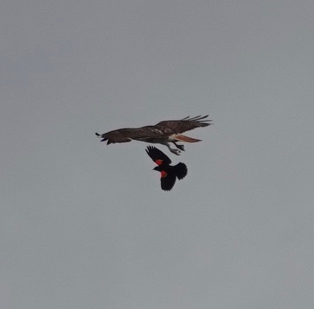 It is the breeding time of year, when smaller birds dare to go after the much bigger, sometimes in teams, other times solo as in this case.
