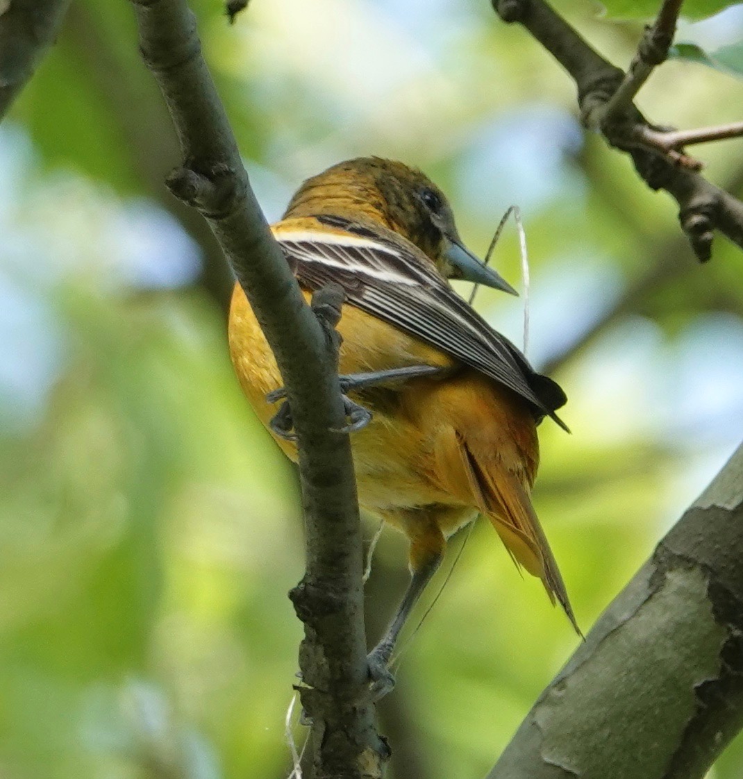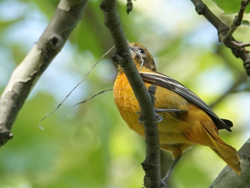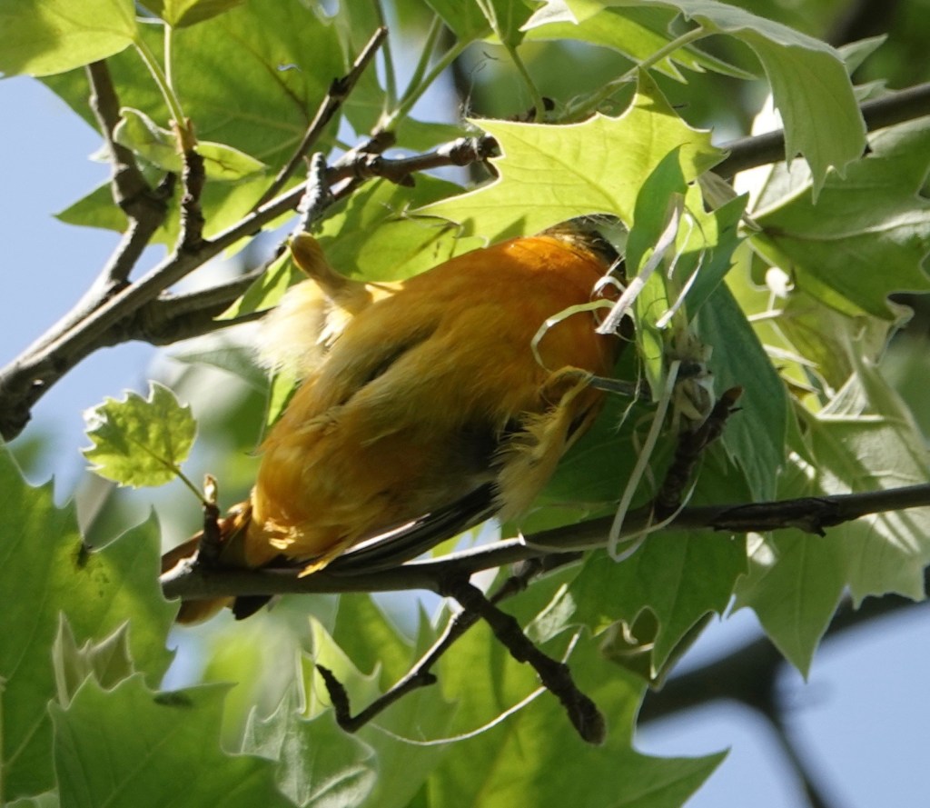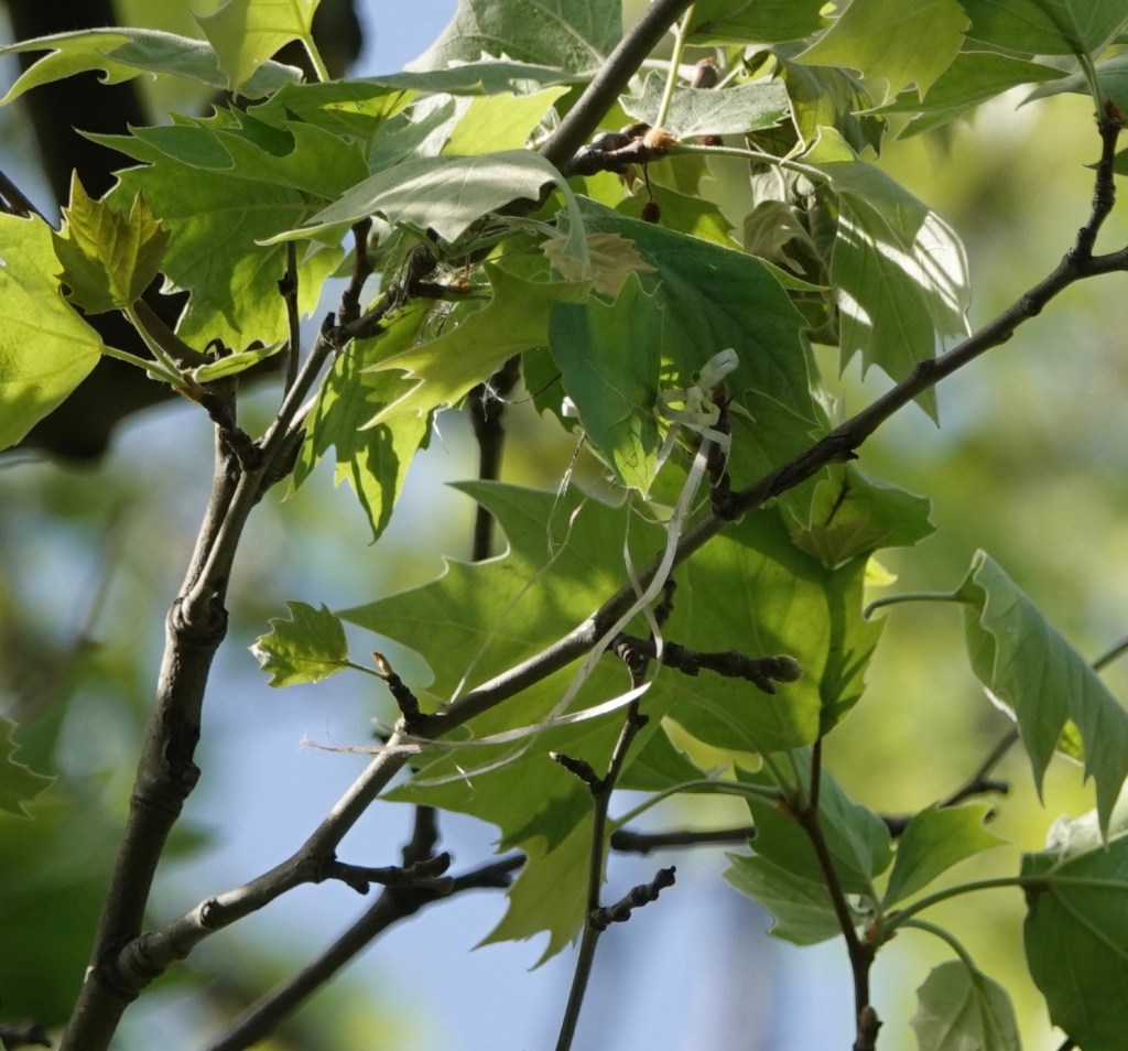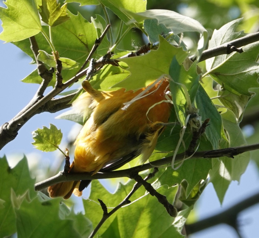 May 8th The beginnings of a Baltimore Oriole woven nest in a London Plane. I’ve noticed that the nests here in Green-Wood are often made up of human-made materials—plastics, ribbons, fibers—and that they don’t break down over the winter—indeed, even several winters—like ones made out of plant materials would.