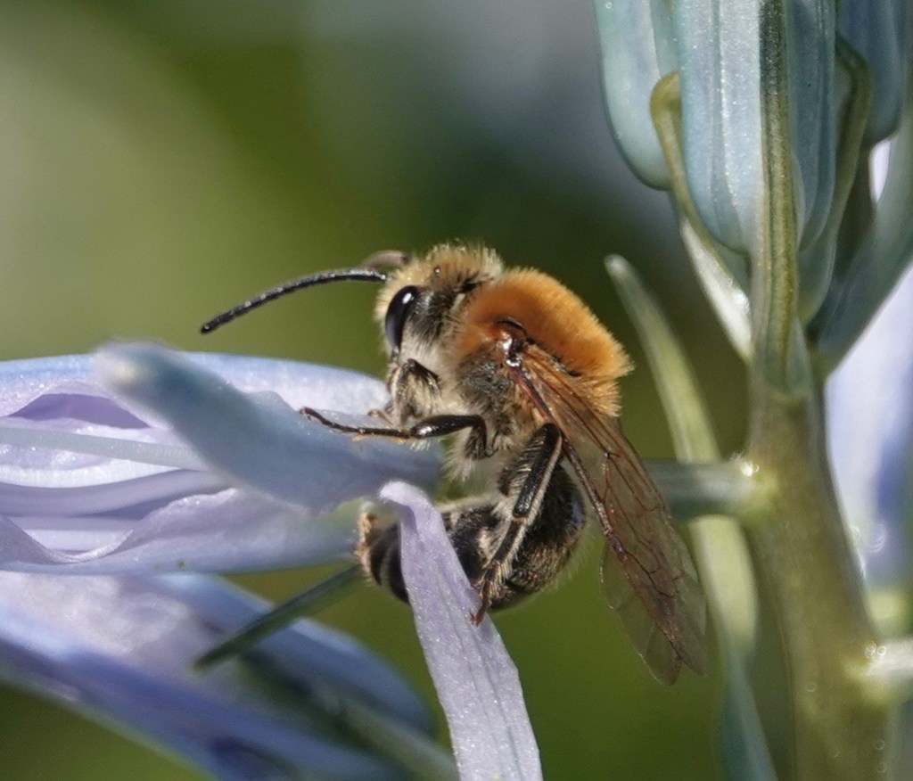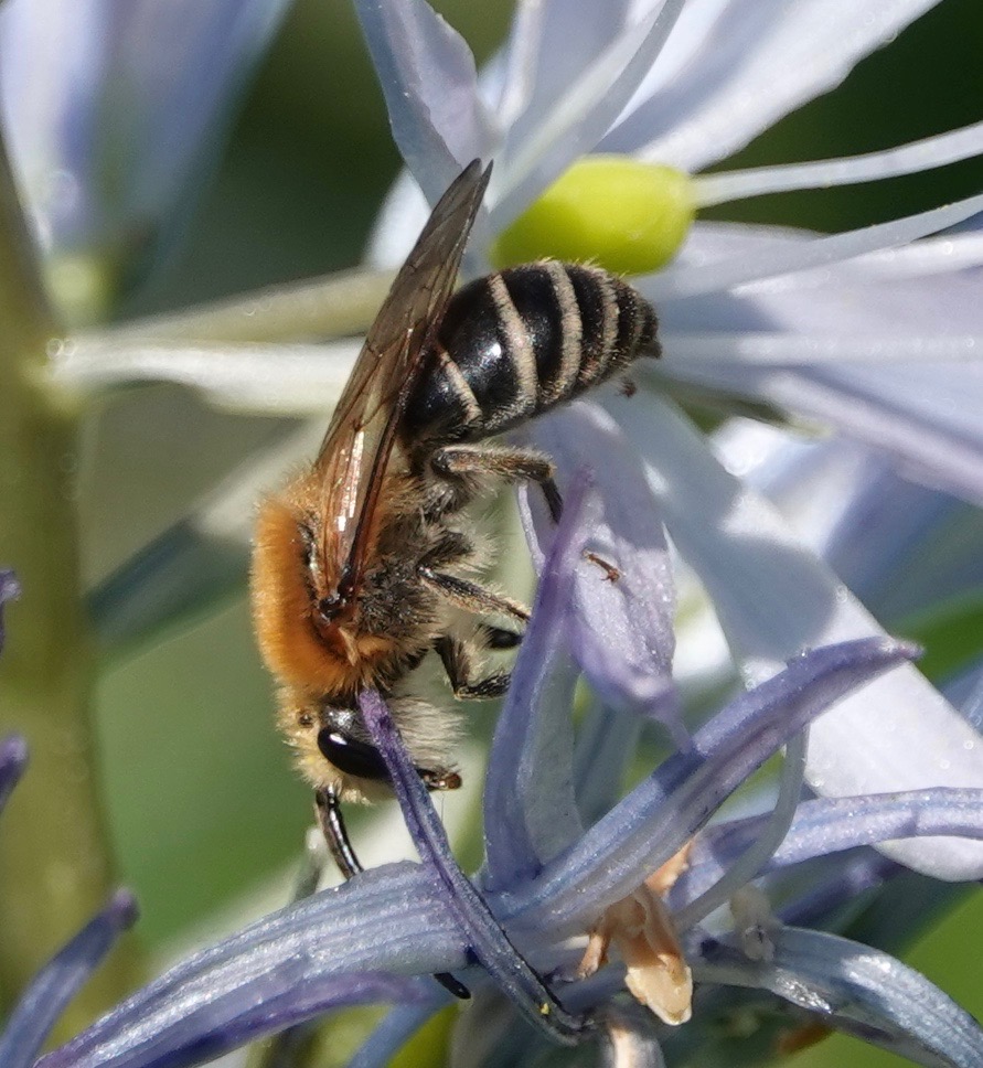 Just over half of our bees are ground-nesters like the Rufous-backed. About 23% of our bees don’t make nests of any kind: they attempt to grab the nests of others. This cleptoparasitic Nomada bee’s mission is to her lay her eggs inside such ground nests as the cellophane bee’s.
