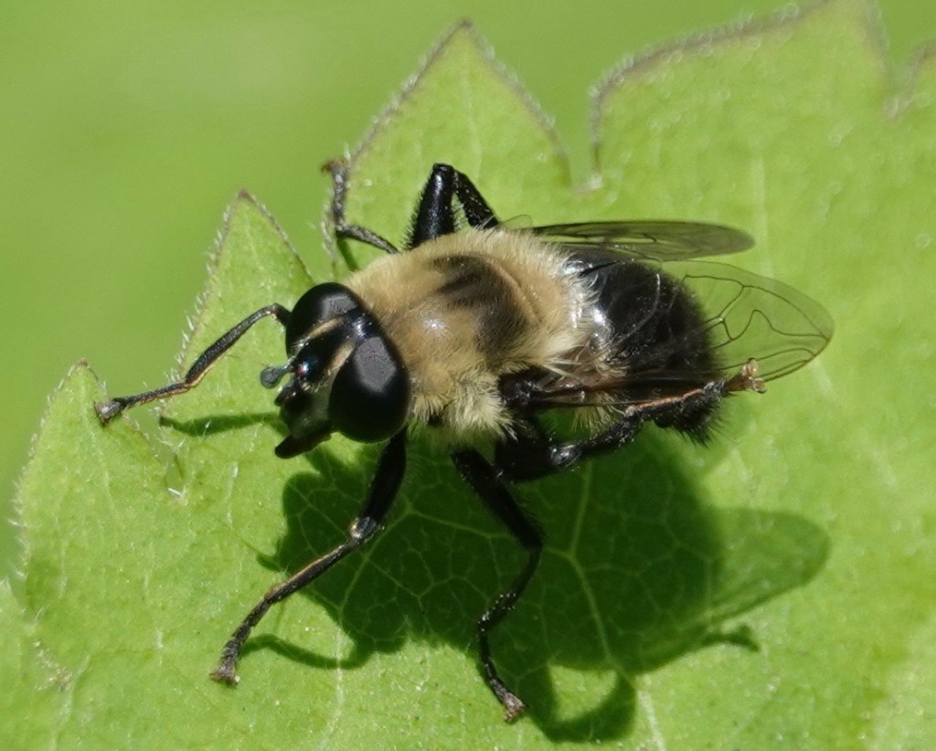 Meanwhile, some not-bees: Narcissus Bulb Fly above, Bare-eyed Mimic Fly below. Your first clue that these these aren’t bees, btw: the very short antennae.