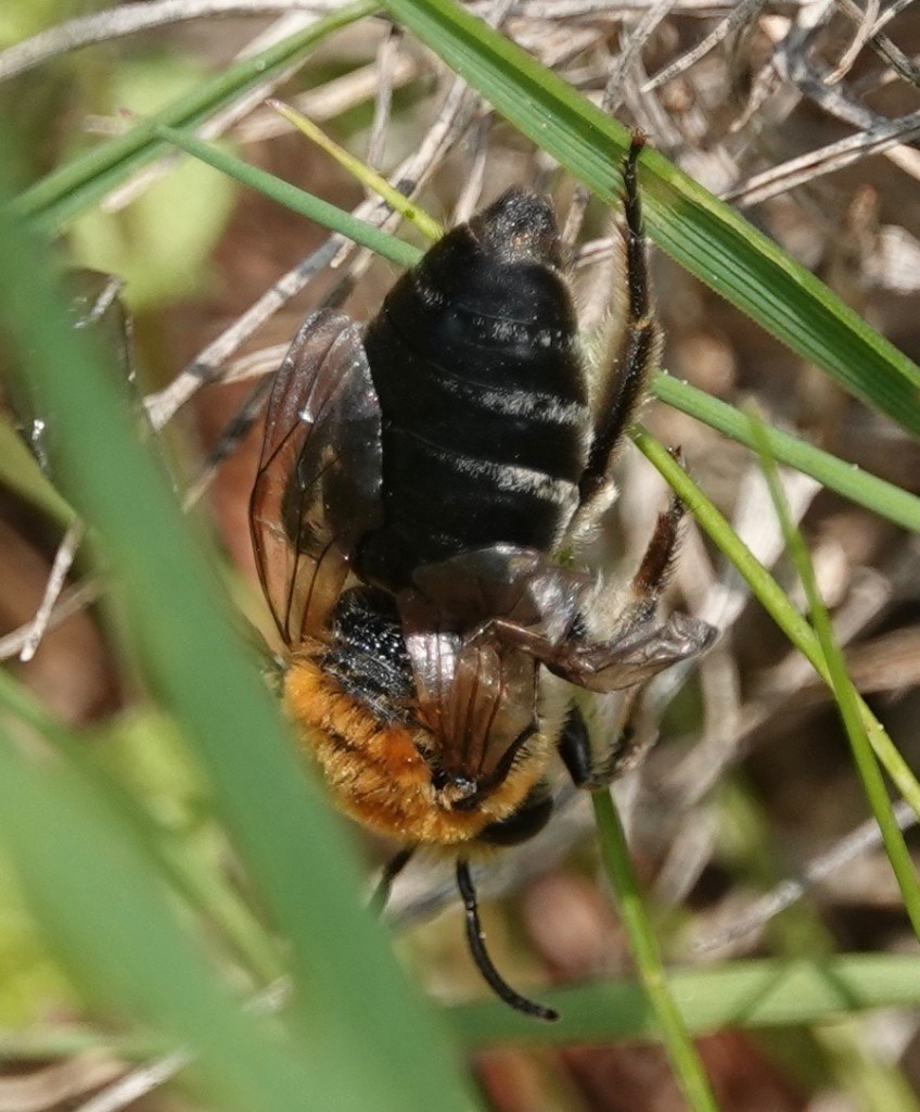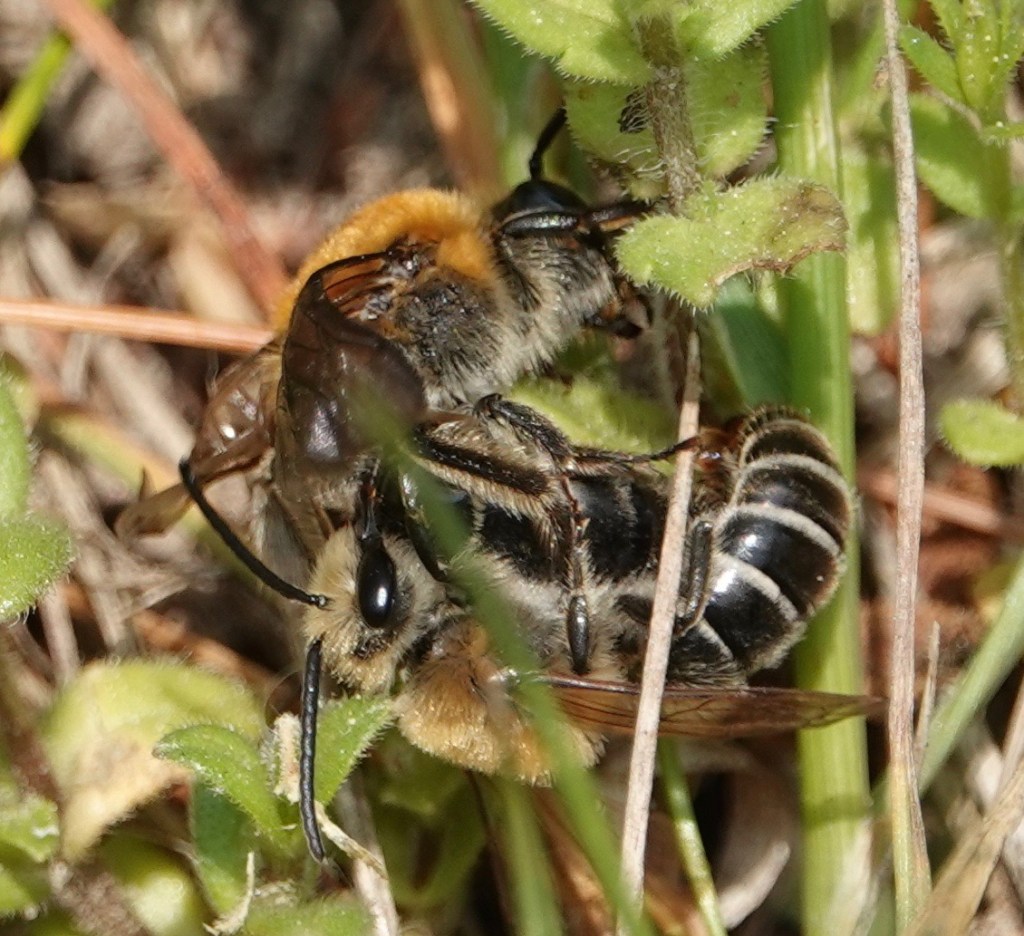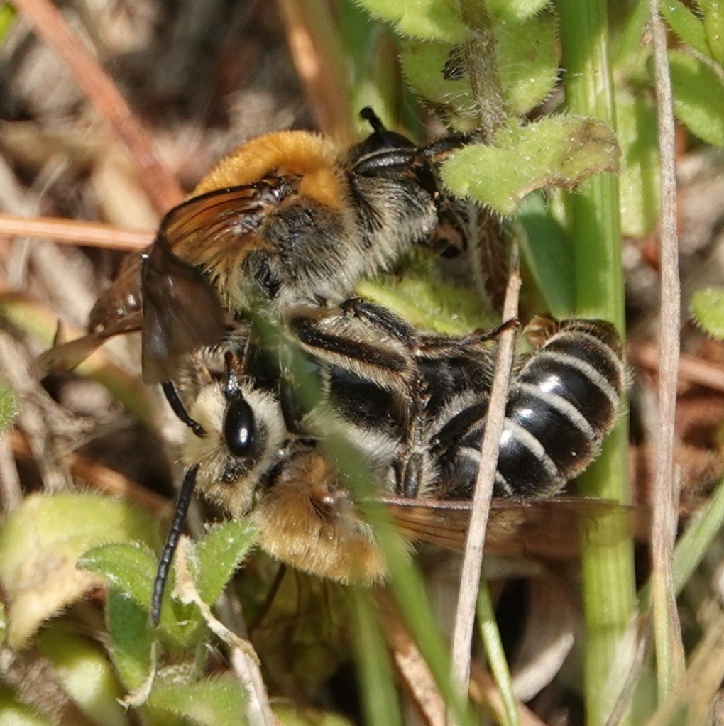 Rufous-backed Cellophane Bees (Colletes thoracicus) mating. This is one of the 4000+ bees species found in North America; and/or one of approximately 450 species found in NYS; and/or one of around 200 species in NYC.