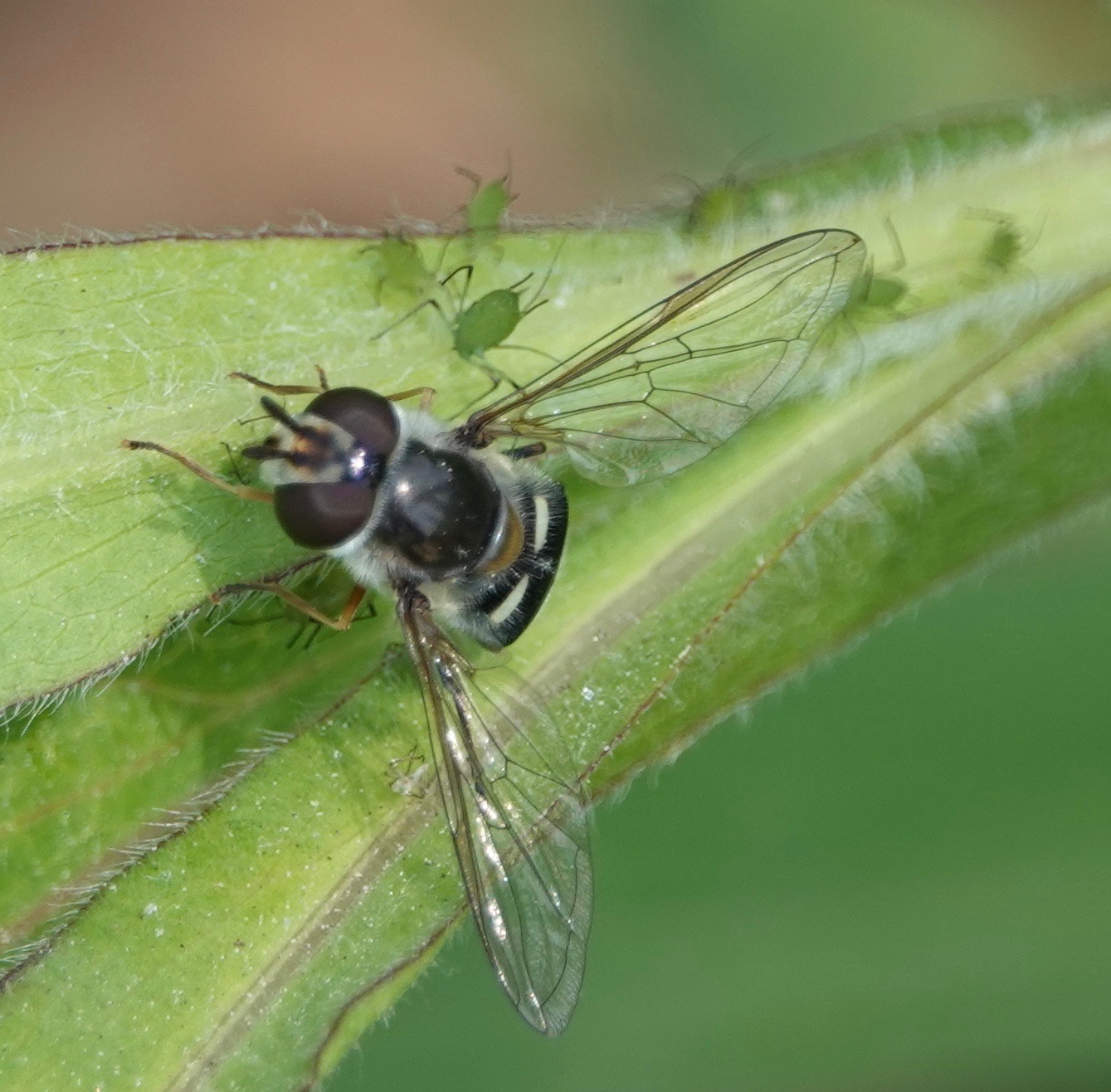 This Bare-winged Aphideater Eupeodes perplexus was probably ovipositing right next to dinner…