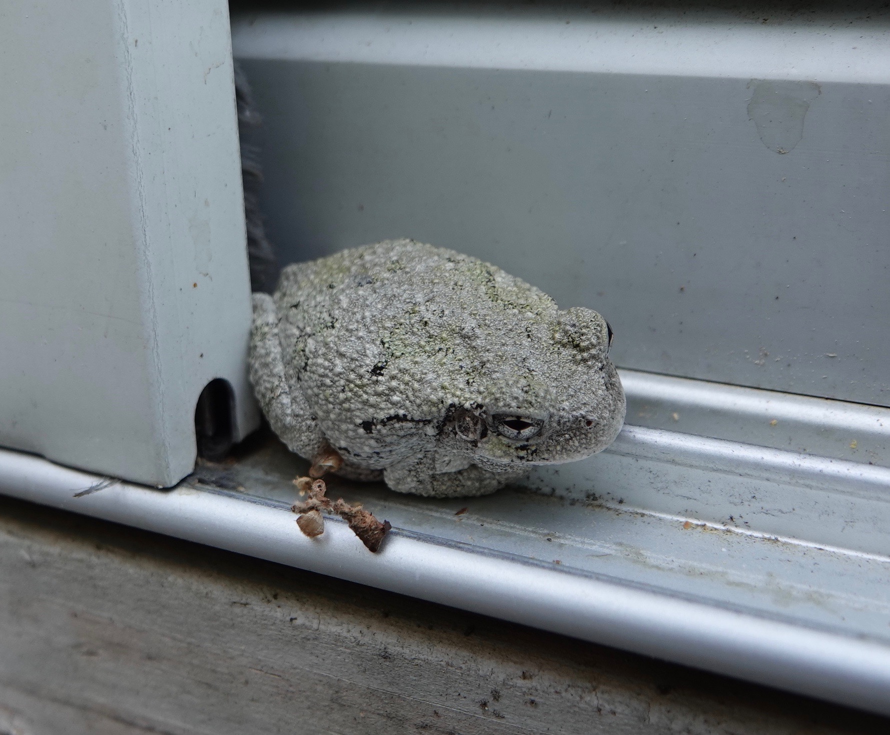 Saturday night, dog-sitting. Take the dog out around 10pm. There’s a loud noise coming from the barely visible pond area down at the beginning of the driveway. First I’ve heard this sound. I record it. I listen to several frog songs online. Ah: Gray Treefrog/Hyla versicolor. The next day I can hear a few more during the day.