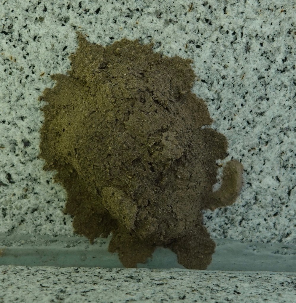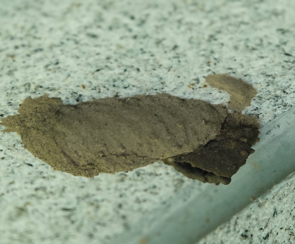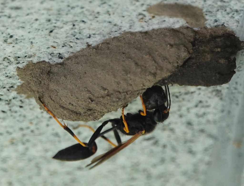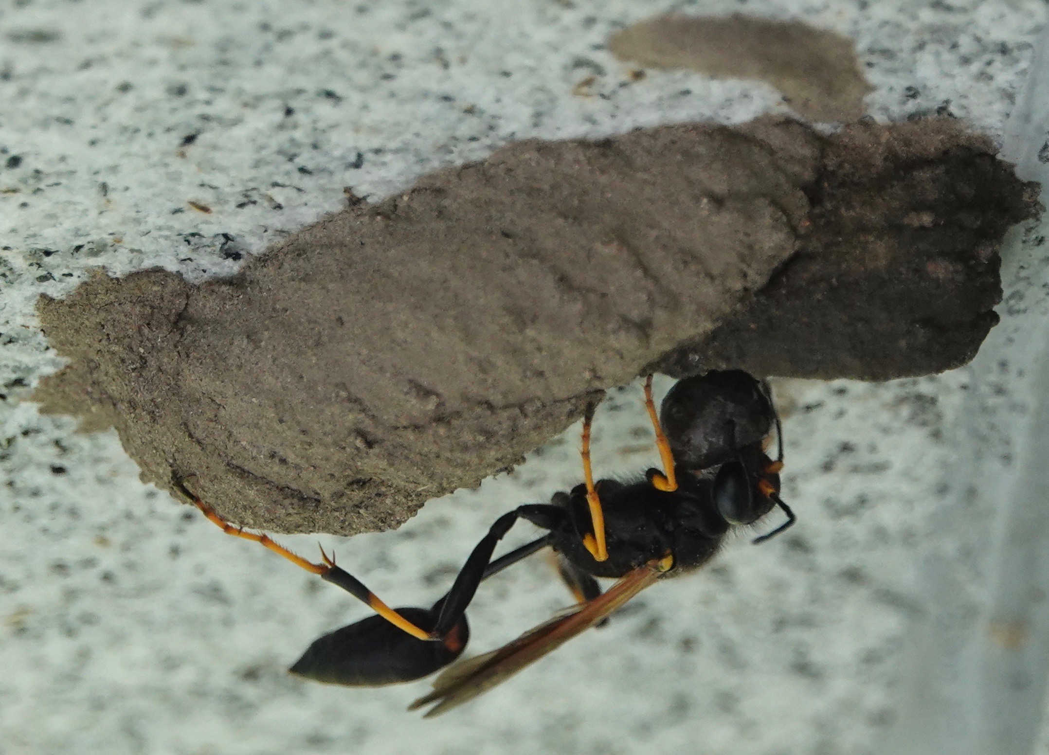 Yellow-legged Mud-dauber Wasp/Sceliphron caementarium working on a second mud tube structure next to an already completed one. Once this tube is done, she will stuff it with paralyzed spiders and lay an egg in there. Note that the mud ball she’s collected somewhere nearby is larger than her head.
