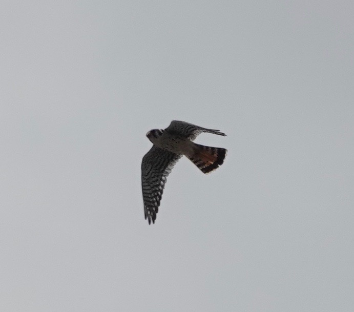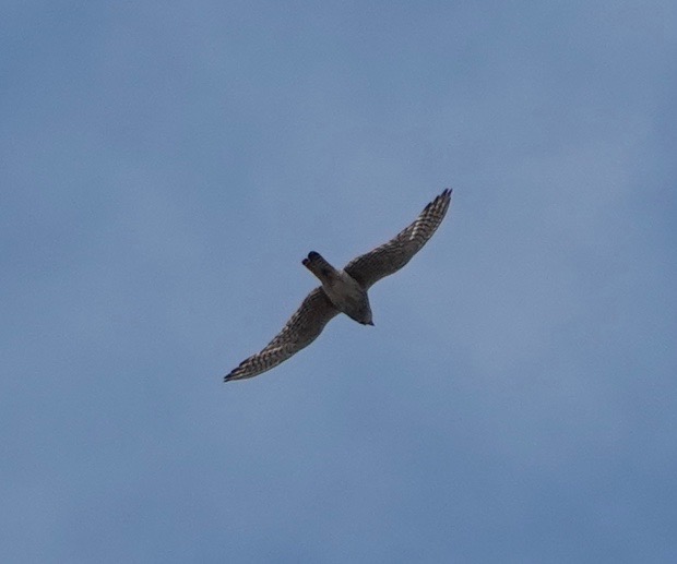 Above Bartel-Pritchard Square at the western-most corner of Prospect Park as I waited for the light to change. The Square is actually a traffic circle, and rather tricky for pedestrians. I heard the bird(s) before seeing them. Could only tell in the camera later that I had at least one female and one male crisscrossing the sky.