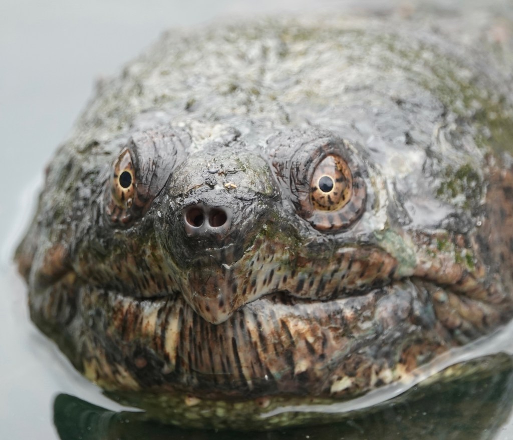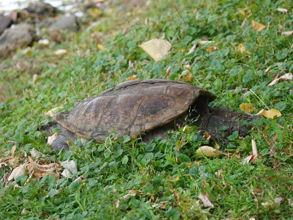 A few Common Snappers have been released into this pond, with permission, from an animal rescue organization. And although wildlife shouldn’t be fed, they are, and hence tend to come up begging.